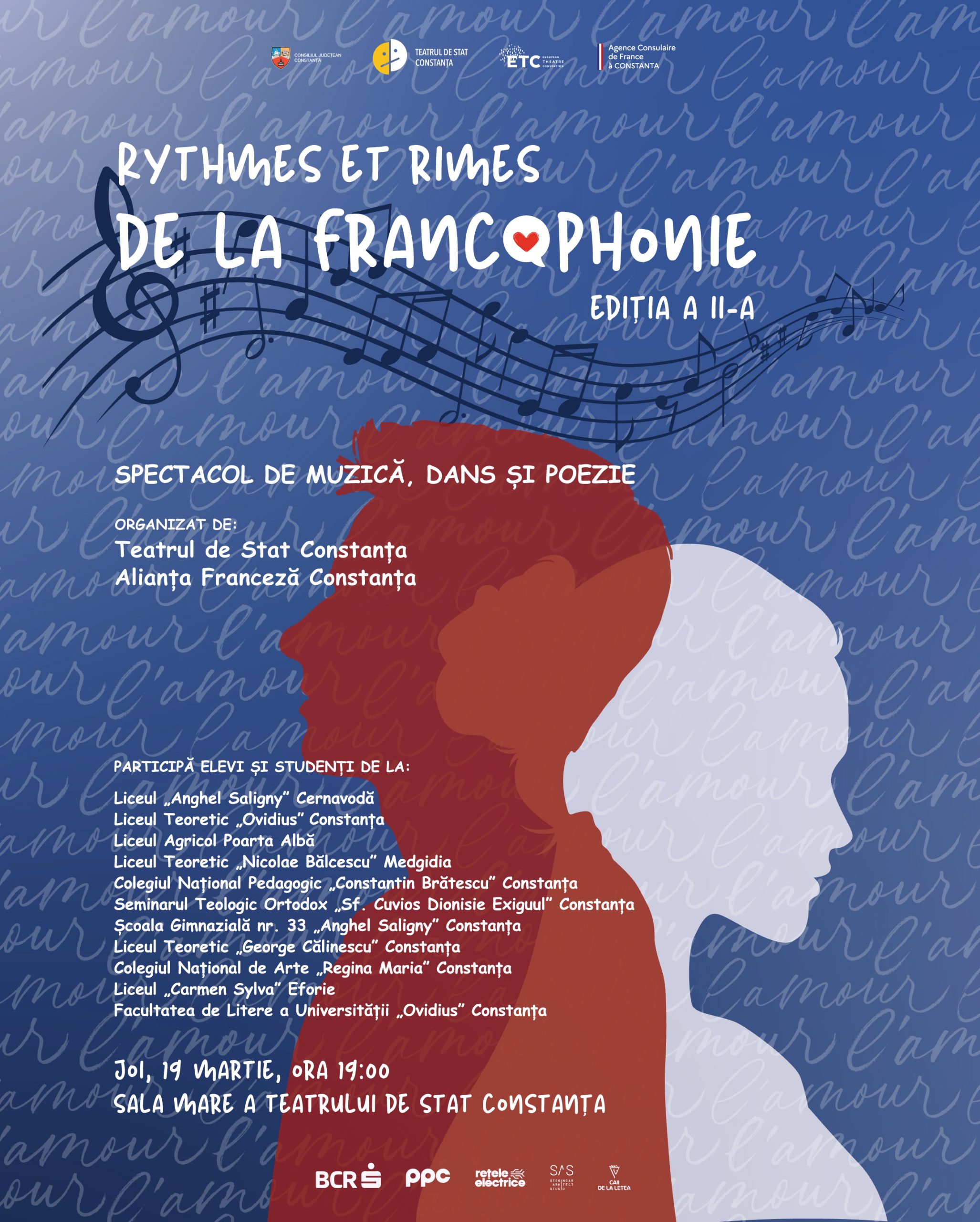 Teatrul de Stat Constanța și Alianța Franceză Constanța organizează joi, 19 martie a.c., de la ora 19:00, la Sala Mare a Teatrului de Stat Constanța, cea de-a doua ediție a spectacolului „Rythmes et rimes de la francophonie”, un eveniment dedicat celebrării limbii franceze și diversității culturale a spațiului francofon.