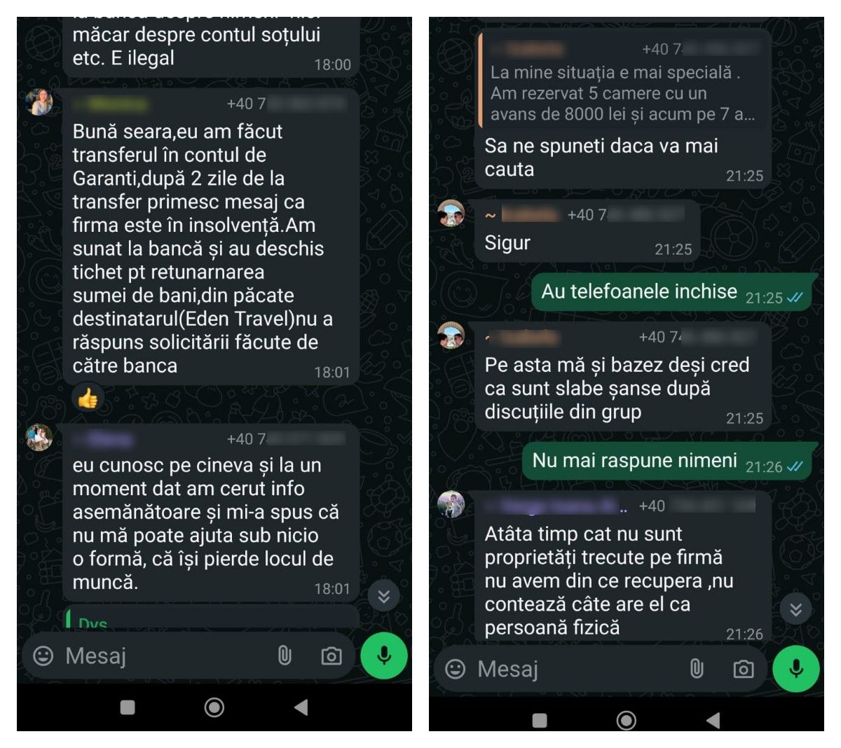 „Am sunat să-i fac mamei mele o rezervare pentru perioada 3-15 noiembrie. De acolo m-au redirecționat să vorbesc cu Eden Travel Partner. Am discutat, mi-au și trimis proforma, foarte prompți. Am plătit 2.500 de lei, totul ok. Pe 31 octombrie am primit un mesaj prin care am fost anunțată că, din motive de ordin financiar, nu mai pot onora finalizarea sejurului. Și că putem reprograma sau ne dau bani înapoi. Apoi, peste două zile și-au închis telefoanele, nu am mai putut da de ei. Am făcut plângeri la ANPC, la Poliție“, a spus aceasta.