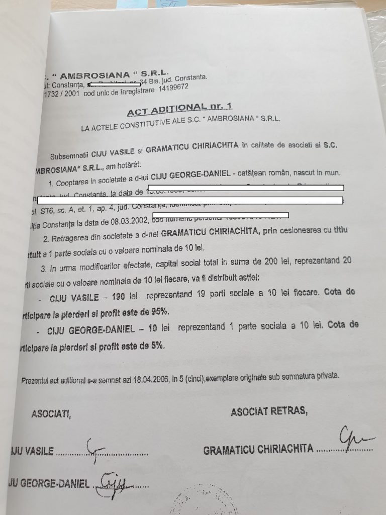 Vom reveni cu detalii despre acest subiect, cu menţiunea că ne-a atras atenţia, referitor la această „celebră” Ambrosiana, şi următorul detaliu: în declaraţia de avere depusă de George Măndilă (consilierul primarului Vergil Chiţac) scrie negru pe alb că acesta a încasat „salariu” de la societatea controlată de Vasile Cîju. Sigur că detaliul nu are nici o legătură cu afacerea pusă la cale de Cîju pentru preluarea pieţei. Ne putem imagina doar că Măndilă oferă consultanţă SC Ambrosiana pentru că este rudă cu familia Cîju.