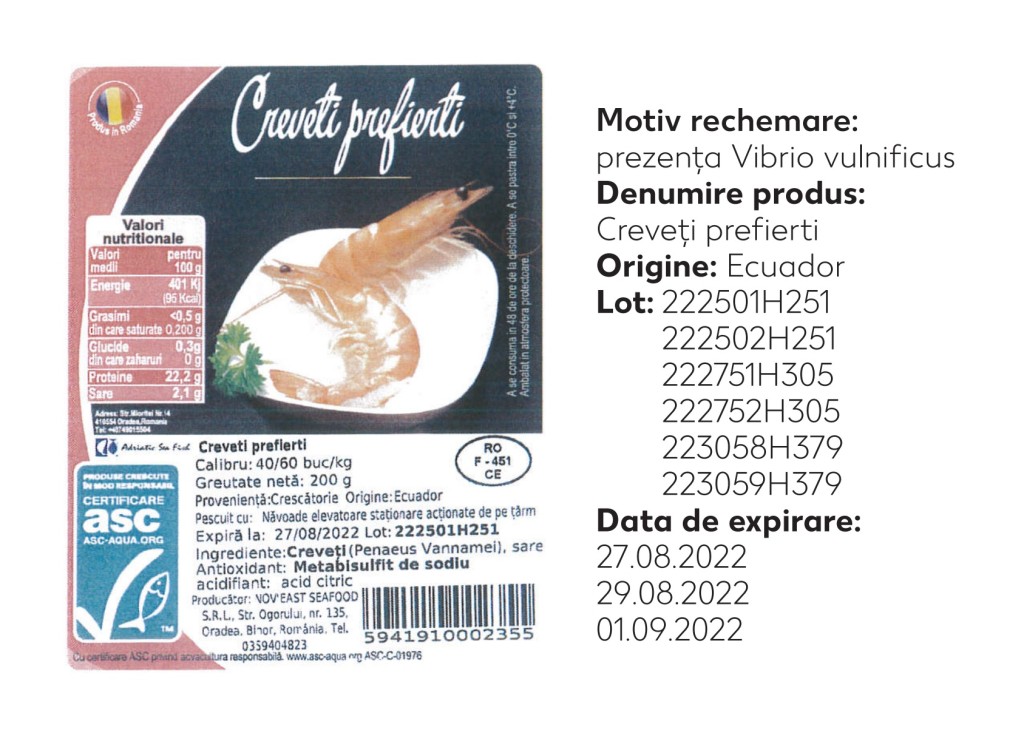 ”Vă informăm că datorită prezenței Vibrio vulnificus în materia primă utilizată pentru loturile de produse finite S.C.NOVEAST SEAFOOD S.R.L. ( distribuitor S.C.ADRIATIC SEA FISH S.R.L.) a inițiat retragerea de la comercializare și rechemarea de la clienți a articolului menționat mai jos, urmare a informațiilor primite de la furnizorul din Franța. În rândul persoanelor sănătoase, ingestia de V. vulnificus poate provoca vărsături, diaree și dureri abdominale. Se recomandă persoanelor care dețin produsul să nu-l consume ci să-l distrugă sau să-l returneze magazinelor de unde a fost cumpărat. Pentru informații suplimentare contactați: S.C.NOVEAST SEAFOOD S.R.L. la quality@noveastseafood.com”, au precizat inspectorii ANSVSA.