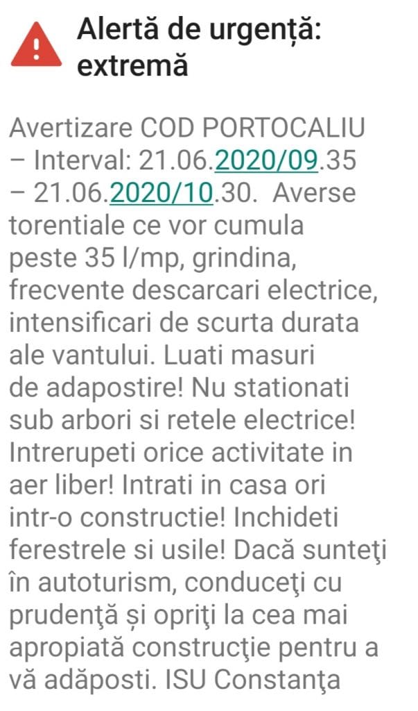 Este alertă de urgență extremă! Constanța se află sub atenționare de Cod portocaliu. Astfel, duminică, 21 iunie, a.c., în intervalul 09:35 – 10:30 sunt prognozate intensificări de scurtă durată ale vântului, averse torențiale ce vor cumula peste 35l/mp, grindină și frecvente descărcări electrice.
