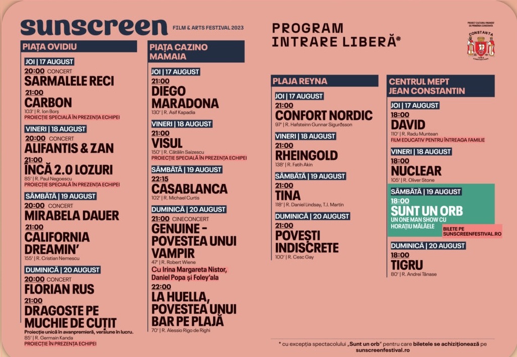 Începând de astăzi (n.r. joi, 17 august), timp de 4 zile, constănțenii și turiștii de pe litoral sunt așteptați la cea de-a doua ediție SUNSCREEN Film & Arts Festival. Evenimentul se deschide în Piața Ovidiu de la ora 20:00, cu un concert aniversar al formației Sarmalele Reci, urmat de proiecția comediei moldovenești Carbon (r. Ion Borș), în prezența echipei, transmite Primăria Constanța.