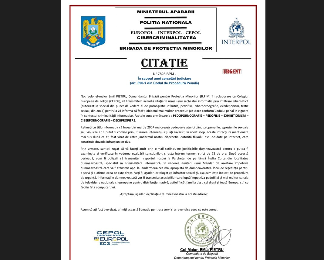 „Noi, colonel-maior Emil PIETRO, Comandantul Brigăzii pentru Protecția Minorilor (BPM), în colaborare cu Colegiul European de Poliție (CEPOL), vă transmitem această citație, în urma unui sechestru informatic, prin infiltrare cibernetică (autorizat în special din punct de vedere de pornografie infantilă, pedofilie, ciberpornografie, exhibiționism, trafic sexual, din 2014), pentru a vă informa că faceți obiectul mai multor proceduri judiciare conform Codului penal în vigoare, în contextul criminalității informatice. Faptele sunt următoarele: pedopornografie – pedofilie – exhibiționism ciberpornografie – decupropiere. Rețineți cu titlu informativ că legea din martie 2007 majorează pedepsele atunci când propunerile, agresiunile sexuale sau violurile ar fi putut fi comise prin utilizarea internetului și ați săvârșit, în acest scop, aceste infracțiuni menționate mai sus după ce ați fost vizat de către jandarmul nostru cibernetic. datorită fluxului dumneavoastră de date pe internet, care constituie dovada infracțiunilor dumneavoastră. Prin urmare, sunteți rugat să vă faceți auzit prin e-mail, scriindu-ne justificările dumneavoastră, pentru a putea fi examinate și verificate, în vederea evaluării sancțiunilor, și asta într-un termen strict de 72 de ore. După această perioadă, vom fi obligați să transmitem raportul nostru la parchetul de pe lângă Înalta Curte din localitatea dumneavoastră, specialist în criminalitate informatică, în vederea emiterii unui mandat de arestare împotriva dumneavoastră, care va fi transmis, apoi, la Jandarmeria cea mai apropiată de dumneavoastră. locul de reședință, pentru a servi și a afirma ceea ce este drept. Veți fi, așadar, catalogat ca infractor sexual și, așa cum este indicat de procedura de urgență, informațiile dumneavoastră vor fi transmise asociațiilor care luptă împotriva pedofiliei și mai multor canale de televiziune naționale și europene, pentru distribuție masivă, astfel încât familia dumneavoastră, cei dragi și toată Europa, să știe ce faci în fața computerului“, este conținutul citației primite de constănțeni de la adresa pauline.leriche@u-picardie.fr, intitulat „Secretariatul de Brigadă“, cu subiectul „Anchetă – Convocare“.