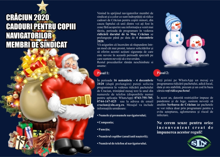 Copiii navigatorilor vor primi cadouri de Crăciun și în acest an. Sindicatul Liber al Navigatorilor vine în sprijinul membrilor de sindicat care sunt îndreptățiți să ridice cadouri pentru copii. „Vă asigurăm că încercăm să răspundem într-un mod cât mai prompt, tuturor solicitărilor și să oferim acestei acțiuni siguranța de care este nevoie în această perioadă specială pe care suntem nevoiți să o traversăm„, anunță reprezentanții SLN.