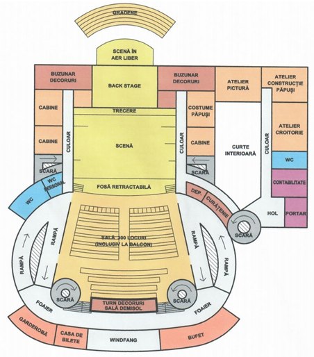 Clădirea va avea sală multifuncțională de spectacole și repetiții (60 de locuri) la demisol, săli de expoziție, sală de spectacol principală (300 de locuri) la parter, backstage, trei unități de cazare și terasă circulabilă la etaj.