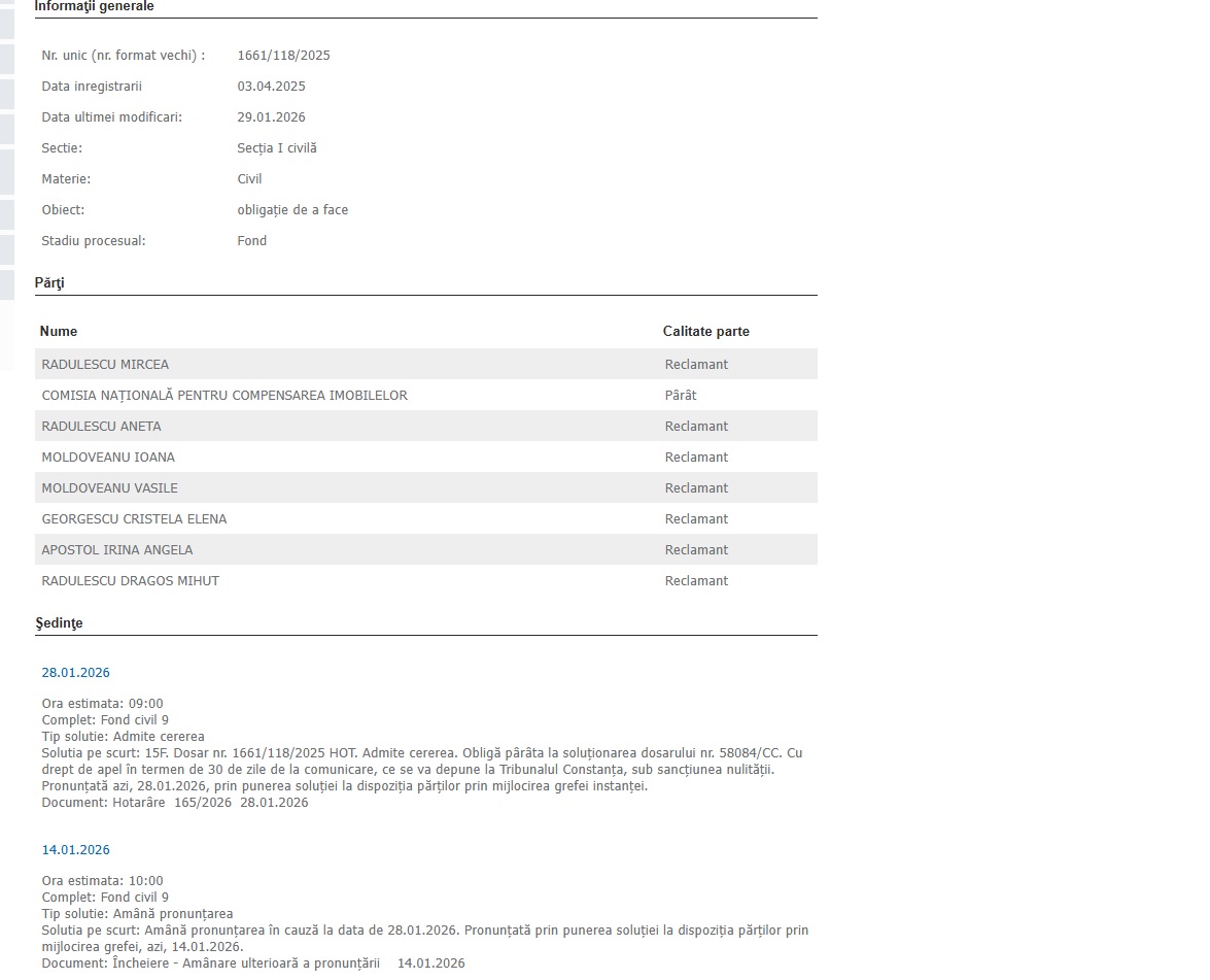 Astfel, dosarul a fost înregistrat la Tribunalul Constanța, pe 3.04.2025, fiind soluționat pe 28.01.2026.