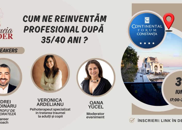 Evenimentul, intitulat „Cum ne REINVENTĂM profesional după 35/40 ani?”, va fi moderat de Oana Yucel, business coach & trainer, alături de doi invitați speciali: