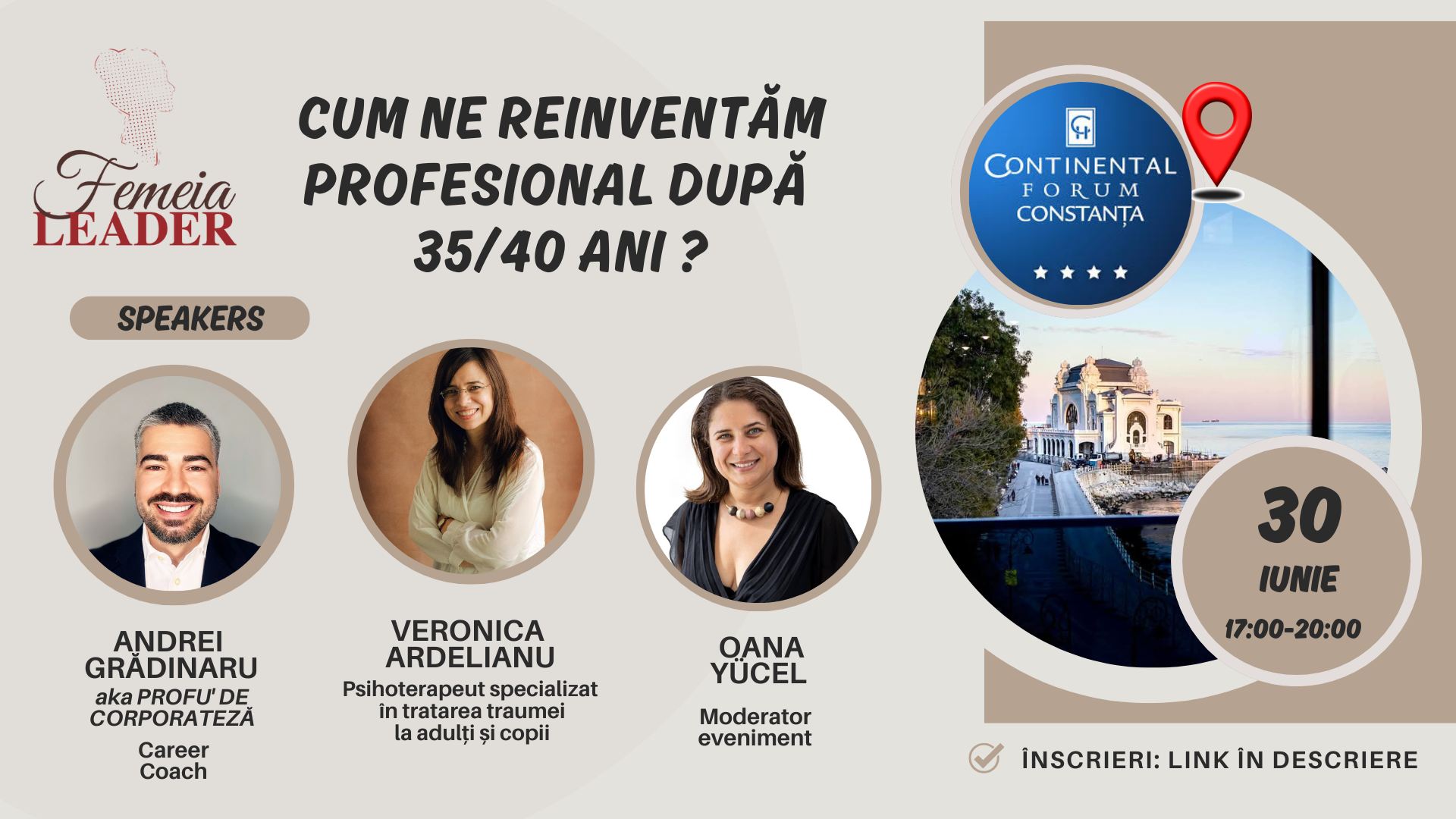 Comunitatea Femeia Leader organizează luni, 30 iunie 2025, un eveniment dedicat femeilor care își doresc o schimbare de direcție profesională sau caută un nou sens în carieră, după vârsta de 35 sau 40 de ani. Întâlnirea va avea loc la Hotel Continental Forum Constanța, începând cu ora 17.00, și promite să ofere 3 ore de inspirație, claritate și încredere.