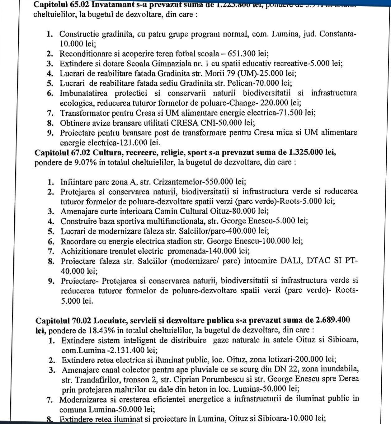 Tot de la capitolul dezvoltare, reținem sumele alocate pentru învățământ (cu o pondere de 5,9% din totalul cheltuielilor), și anume: 10.000 lei construcție grădiniță în Lumina, 651.300 lei pentru recondiționare și acoperire teren de fotbal școală.