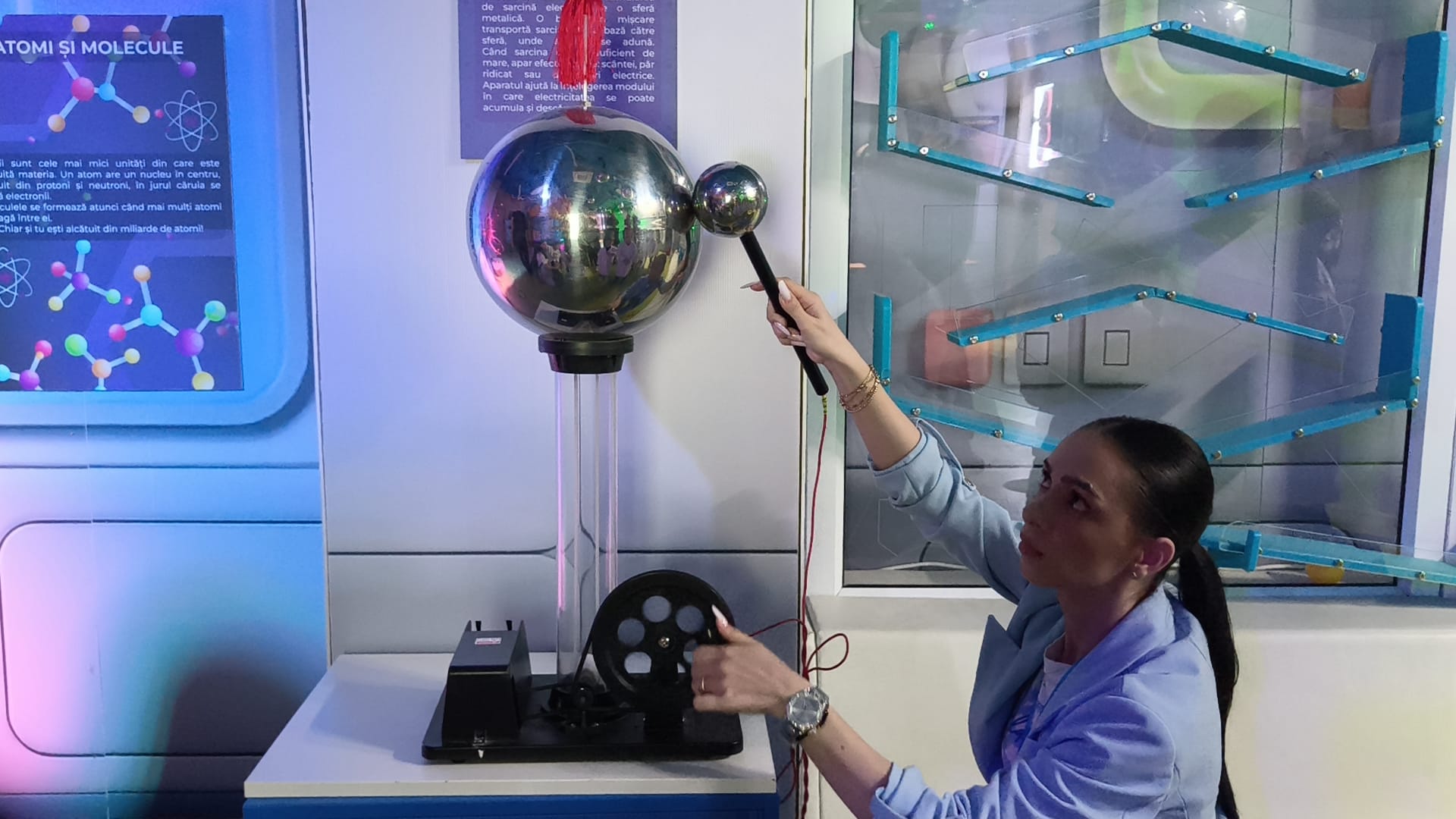 Unul dintre punctele de atracție este globul cu energie statică, care, la atingere, creează impresia unui curent misterios ce se propagă prin degete, stârnind exclamații și zâmbete. Oglinzile speciale îi provoacă pe cei mici să descopere iluzii optice surprinzătoare, în timp ce turbosuflanta pune în mișcare mingi ușoare, demonstrând într-un mod ludic principiile aerodinamicii.