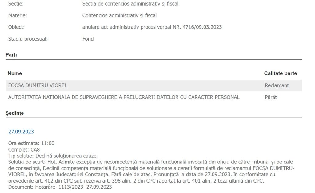 Deputatul Dumitru Viorel Focșa a chemat în judecată, la Constanța, Autoritatea Națională de Supraveghere a Prelucrării Datelor cu Caracter Personal (ANSPDCP), pentru a scăpa de o amendă primită în primăvara acestui an.