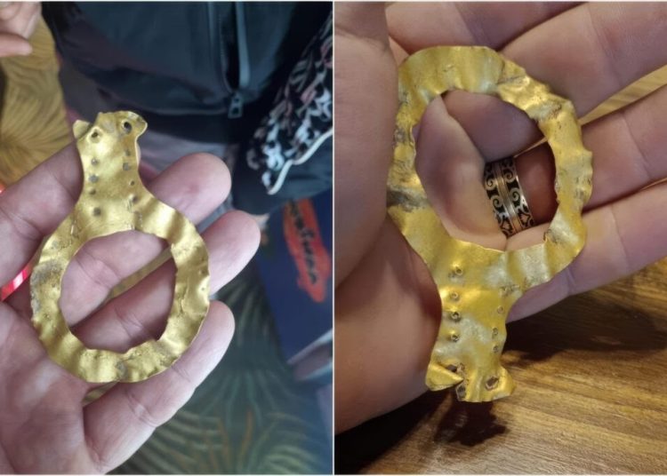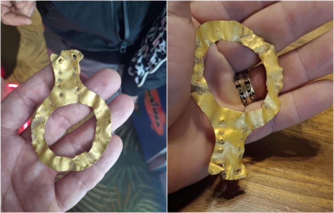 Descoperire rară în județul Olt. Un bărbat a găsit, în urmă cu câteva zile, lângă o pădure din comuna Ghimpețeni un obiect de 20 de grame din aur, cu o vechime de peste 5.000 de ani. Acesta a folosit un detector de matele.
