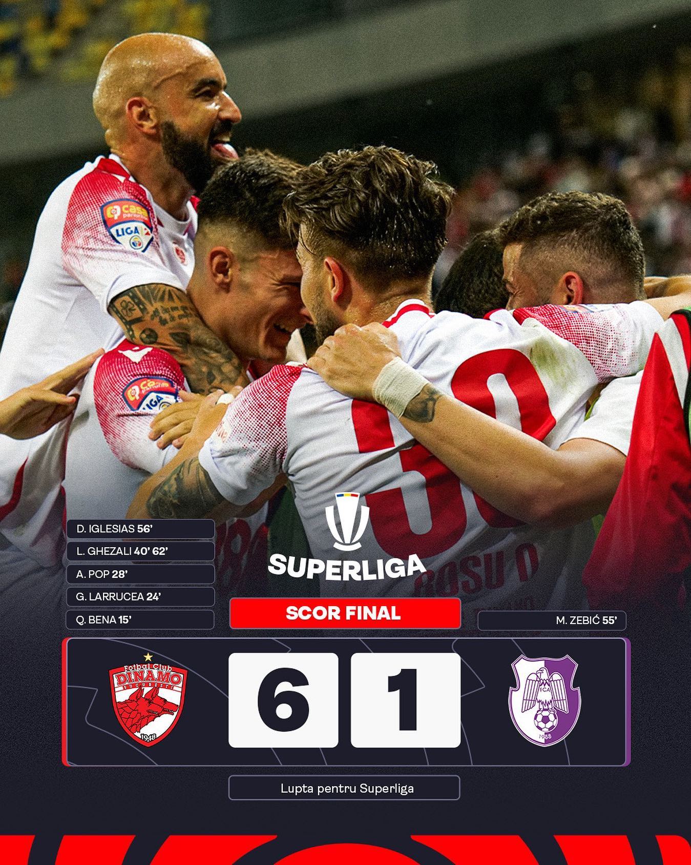 Dinamo avea deja 4-0 în prima repriză, după golurile marcate de Bena (min.15), Larrucea (min.24), Pop (min.28), Ghezali (min.40).