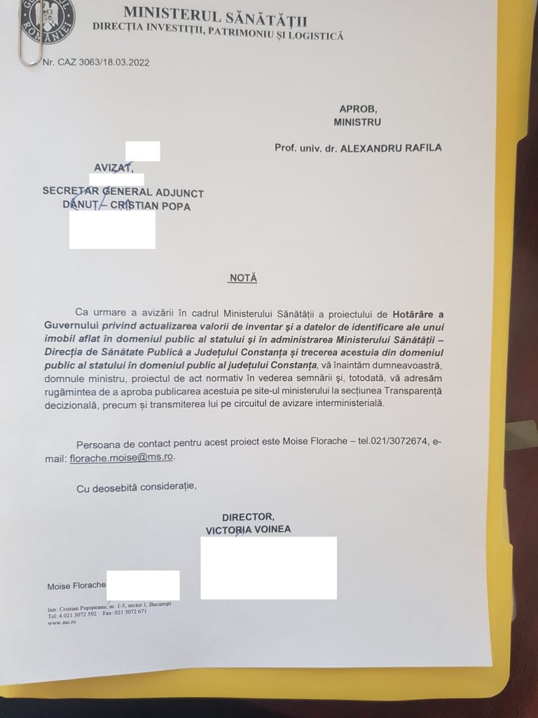 Ministerul Sănătății a avizat proiectul de hotârâre a Guvernului pentru actualizarea valorii de inventar și a datelor de identificare a terenului solicitat de Consiliul Județean Constanța pentru construirea unui nou spital și trecerea acestuia din domeniul public al Statului – aflat în administrarea Direcției de Sănătate Publică Constanța – în domeniul public al Județului Constanța.