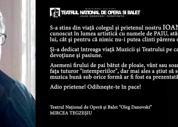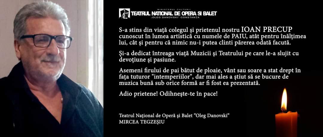 Doiliu printre artiștii constănțeni. Ioan Precup, artist la Teatrul Național de Operă și Balet Oleg Danovski s-a stins din viață. Anunțul a fost postat pe pagina de Facebook a Teatrului Oleg Danovski Constanța.