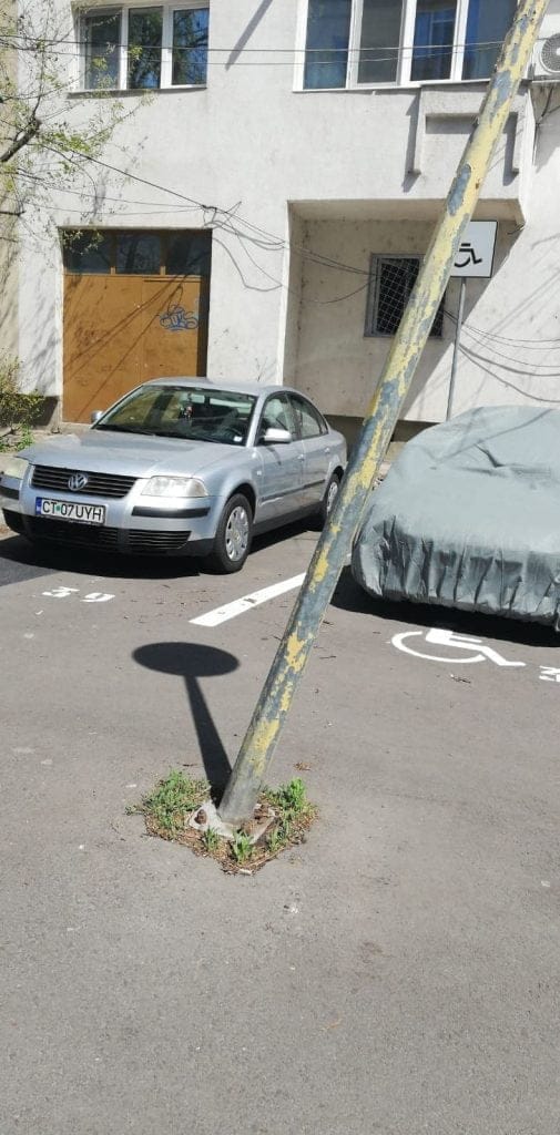 Toate bune şi frumoase, numai că în fiecare zonă din municipiu, dacă o iei la pas, găseşti şi imperfecţiuni, cât şi constănţeni nemulţumiţi de lucrările edilitare. „Nu suntem prea mulţi cei care comentăm că nu e bine, aşa că nu cred că va conta părerea noastră. Totuşi, poate cineva se gândeşte să remedieze porcăria pe care au făcut-o în parcarea de pe bulevardul Aurel Vlaicu nr. 9, la blocul C2. Au reamenajat parcarea şi au lăsat stâlpul de iluminat în mijlocul parcării. Nici nu e de mirare că a fost lovit de o maşină”, ne spuns Radu B. Într-adevăr, la faţa locului găsim un stâlp de iluminat strâmb, „uitat” de „Dorel” în mijlocul parcării.
