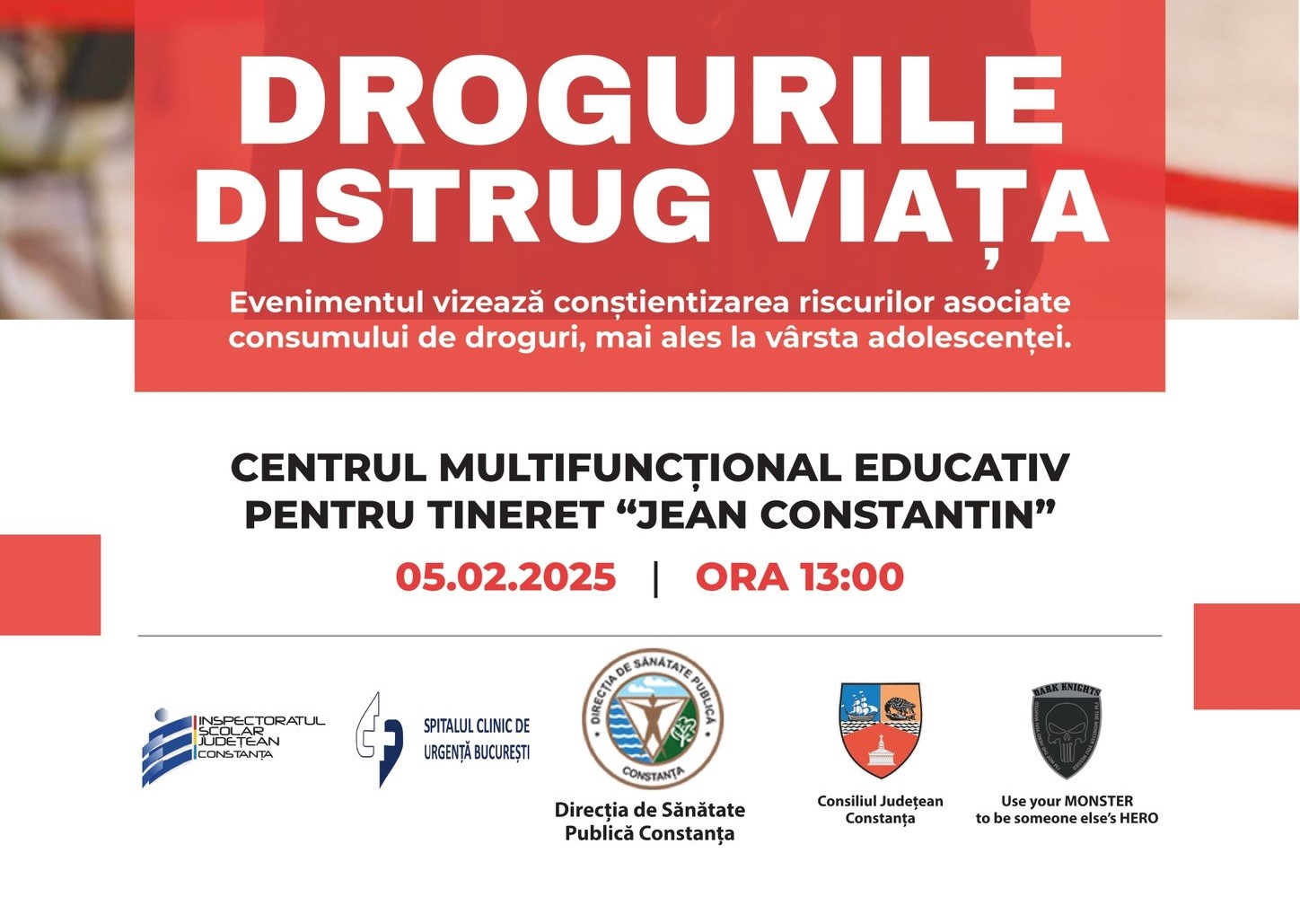 Direcția de Sănătate Publică Constanța organizează un eveniment în cadrul căruia vor fi prezentate pericolele consumului de droguri și impactul acestuia asupra sănătății și vieții sociale.