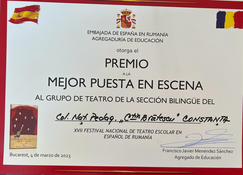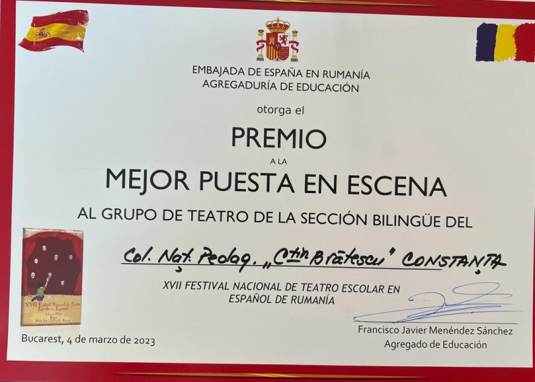 Elevii Colegiului Național Pedagogic ,,Constantin Brătescu’’ din Constanța au fost premiați de Ministerul Educației și Ambasada Spaniei la București la Festivalul Național de Teatru Școlar în Limba Spaniolă.