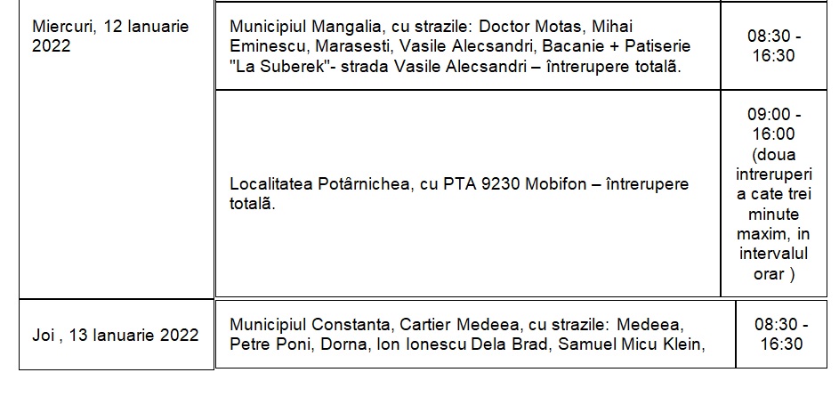 Următoarele întreruperi se vor realiza pentru a asigura capacitatea rețelei de a funcționa și alimenta clienții în bune condiții.
