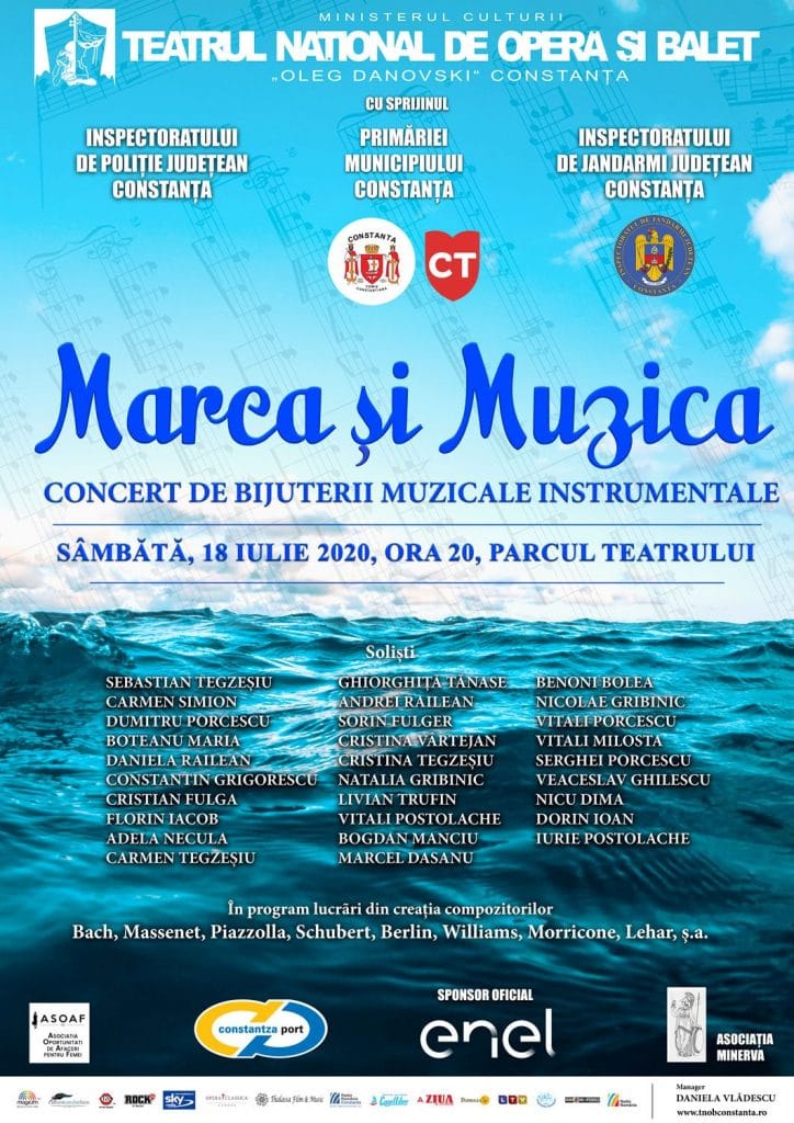 Concertul de bijuterii muzicale instrumentale „Marea și Muzica” va fi prezentat publicului sâmbătă, 18 iulie, de la ora 20:00. Evenimentul se va desfășura cu participarea soliștilor: Sebastian Tegzeșiu, Carmen Simion, Dumitru Porcescu, Boteanu Maria, Daniela Railean, Constantin Grigorescu, Cristian Fulga, Florin Iacob, Adela Necula, Carmen Tegzeșiu, Ghiorghiță Tănase, Andrei Railean, Sorin Fulger, Cristina Vârtejan, Cristina Tegzeșiu, Natalia Gribinic, Livian Trufin, Vitali Postolache, Bogdan Manciu, Marcel Dășanu, Benoni Bolea, Nicolae Gribinic, Vitali Porcescu, Vitali Milosta, Serghei Porcescu, Veaceslav Ghilescu, Nicu Dima, Dorin Ioan, Iurie Postolache.