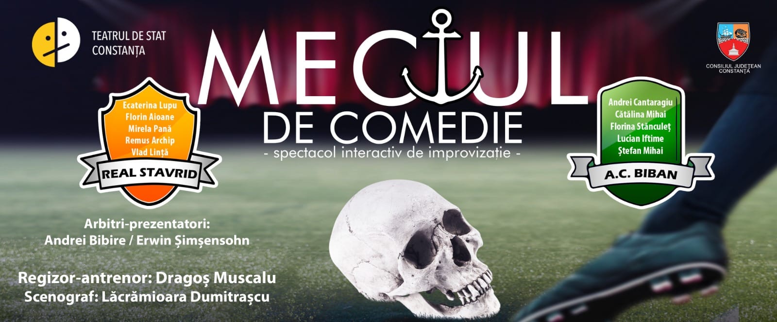 Teatrul de Stat Constanța vă invită în acest weekend la trei spectacole în aer liber. Vineri și sâmbătă, actorii Florin Aioane, Remus Archip, Andrei Bibire, Andrei Cantaragiu, Lucian Iftime, Vlad Lință, Ecaterina Lupu, Cătălina Mihai, Ștefan Mihai, Mirela Pană și Florina Stănculeț vor intra în teren și vor fi acompaniați de tânărul și talentatul Mădălin Nicolae Mușat, absolvent al Colegiului Național de Arte „Regina Maria” în „Meciul de comedie- spectacol interactiv de improvizație”.