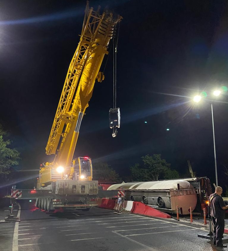 După aproximativ două ore, o macara a ajuns la locul răstunării cisternei cu motorină, pe DN39, și se încearcă ridicarea acesteia.