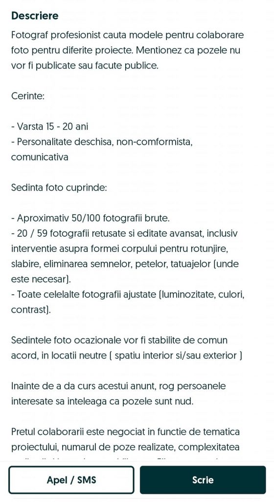 Pe OLX a apărut un anunț potrivit căruia un fotograf profesionist caută fete cu vârste cuprinse între 15 și 20 de ani care să pozeze goale. Cu preț negociabil, în funcție de tematica fotografiile, numărul și complexitatea lor etc.