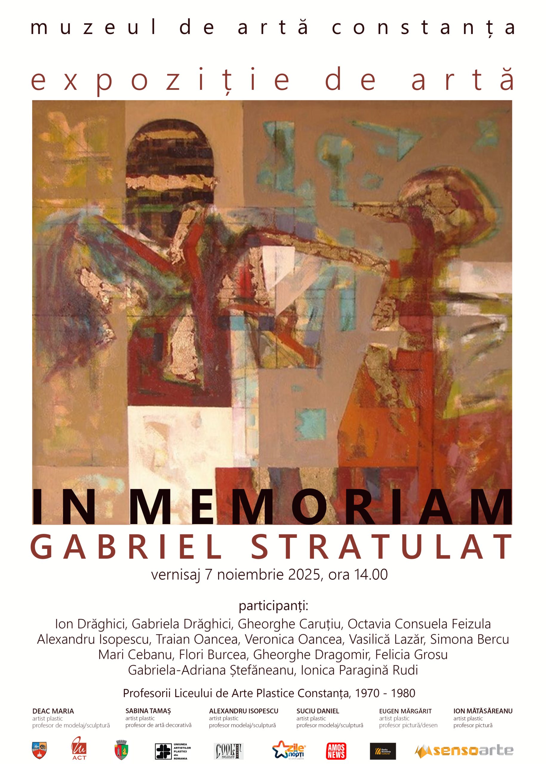 Vineri, 7 noiembrie a.c., la ora 14.00, la Muzeul de Artă Constanța, se deschide expoziția „In memoriam, Gabriel Stratulat”. Expoziția reunește lucrări de pictură și grafică, semnate de artistul Gabriel Stratulat și o serie de lucrări de pictură, grafică și ceramică, realizate de artiști invitați în expoziție. Sunt invitați să expună artiștii Simion Bercu, Flori Burcea, Mari Cebanu, Gheorghe Caruțiu, Gheorghe Dragomir, Gabriela Drăghici, Ion Drăghici, Octavia Consuela Feizula, Felicia Grosu, Alexandru Isopescu, Vasilică Lazăr, Traian Oancea, Veronica Oancea, Ioana Rudi Paragină, Gabriela Adriana Ștefăneanu.