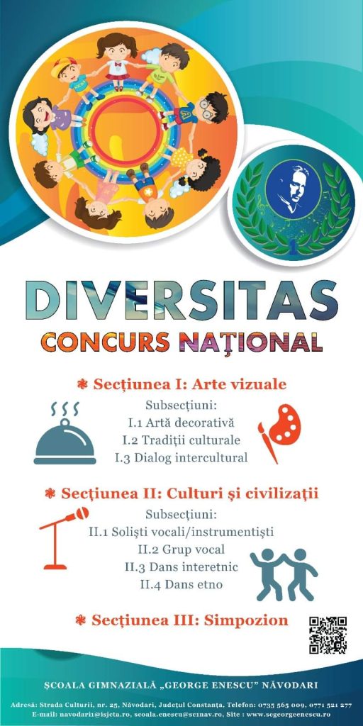 Timp de două zile, pe 25 şi 26 mai a.c., Şcoala Gimnazială „George Enescu“ din Năvodari dă startul celei de a VI-a ediţie a Concursului Naţional „DIVERSITAS“, concurs înscris în Calendarul Activităţilor Educative Naţionale 2023- domeniul cultural-artistic, culturi şi civilizaţii.