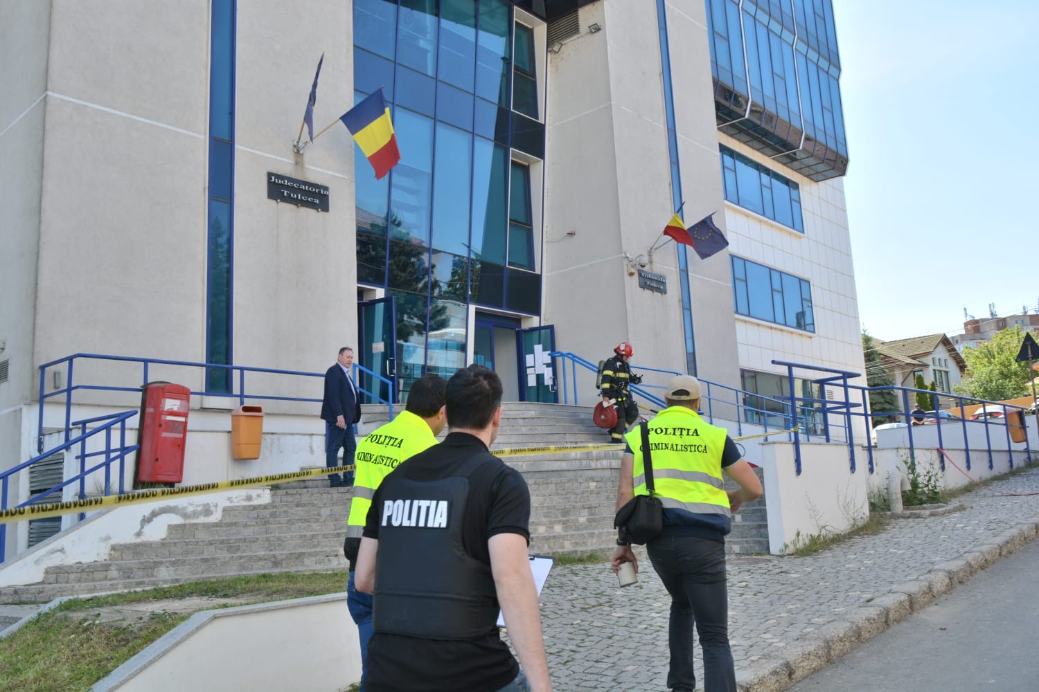 În cadrul exercițiului, a fost simulată intervenția forțelor de ordine în cazul unui incendiu produs în sala de judecată a Judecătoriei Tulcea.