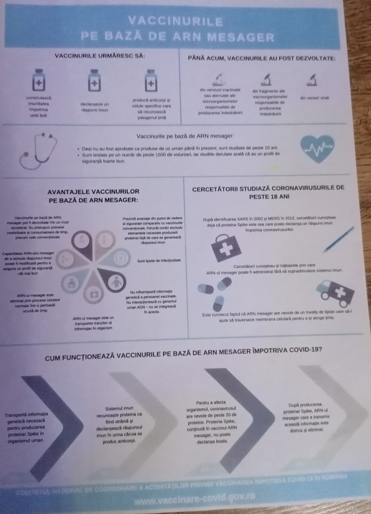 Dr. Irina Magdalena Dumitru: Este un vaccin sigur. Reacţiile adverse sunt cele pe care le întâlnim la toate vaccinurile pe care le facem în viaţa noastră sau la vaccinul antigripal. Avem reacţii adverse locale, cu roşeaţă şi durere locală, pentru că se administrează intramuscular. Pot apărea reacţii generale, cu febră, stare de curbatură, mialgi, pentru că trebuie să apară un răspuns imun acolo şi este normal să facem puţină febră. Pot fi şi reacţii digestive, greaţă, senzaţie de vomă, scaune diareice, dar cam atât. Nu s-au semnalat reacţii adverse importante. Nu discutăm despre un virus viu atenuat aşa cum întâlneam la alte vaccinuri cum a fost vaccinarea antipolio. Vaccinarea antipolio a fost laborioasă şi mult mai pretenţioasă, pentru că era un virus viu atenuat şi care creat nişte probleme în organism. Acum discutăm despre o bucată de ARN mesager, care pătrunde în organism, dă acel mesaj organismului şi conţine mesajul privind structura unei proteine, respectiv proteina spike cea care declanşează răspunsul imun în organism. În momentul în care organismul este capabil să declanşeze răspunsul imun şi apar aceşti anticorpi acest ARN mesager se distruge. Nu pătrunde nicăieri. Au fost foarte multe speculaţii. Pur şi simplu este distrus. Mi-a plăcut foarte mult comparaţia domnului prof. Răzvan Cherecheș de la Cluj. El spunea să ne gândim că este ca o construcție de la IKEA. Vreți să faceți un pat sau un șifonier și aveți suporți. În momentul în care faceți șifonierul acel suport în care a stat șifonierul este distrus. Pur și simplu îl arunci la gunoi, dar rămân acei anticorpi foarte importanți.