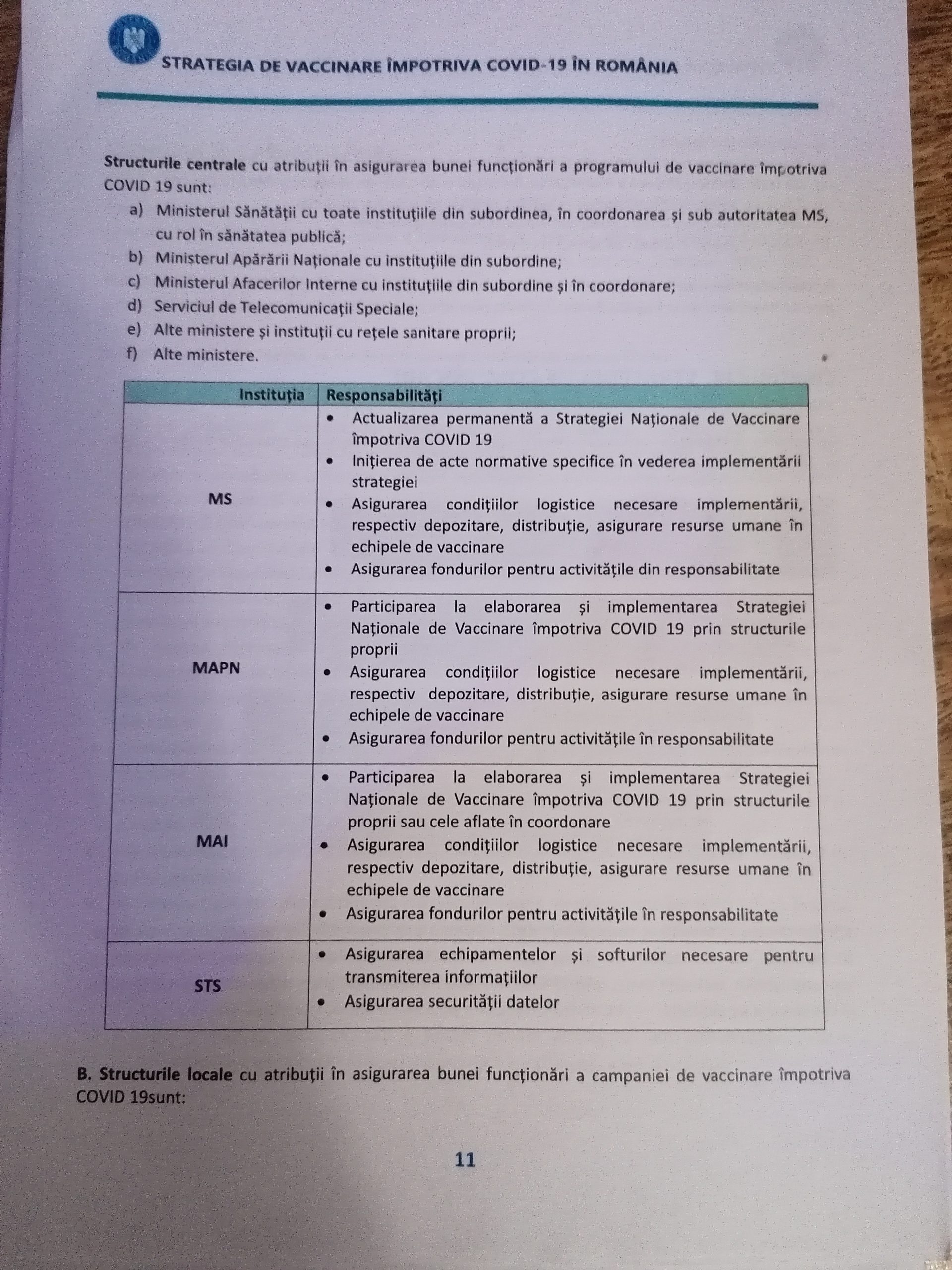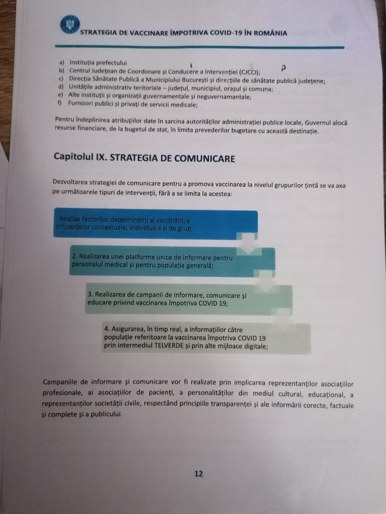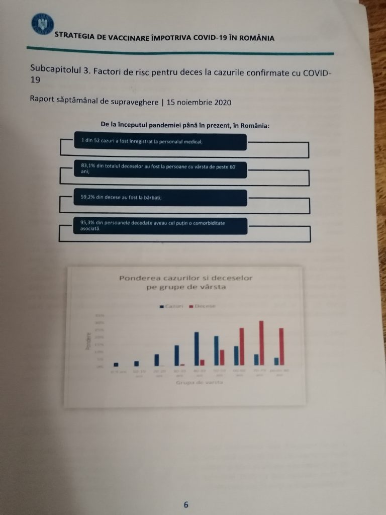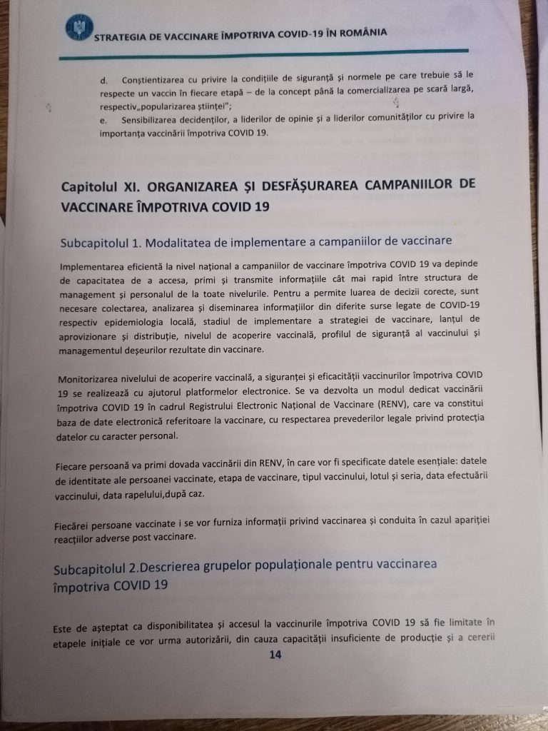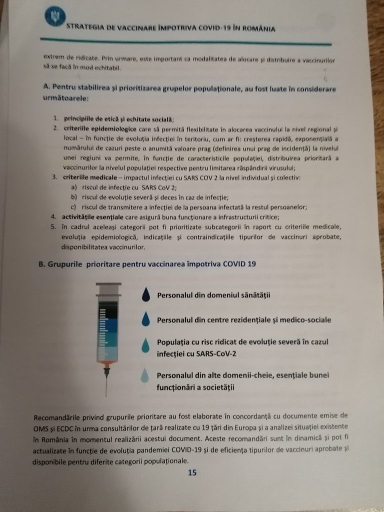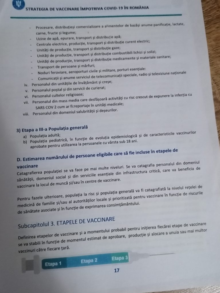 Dr. Irina Magdalena Dumitru: Sunt trei etape. Sunt două doze de vaccin. Prima doză o vom primi pe 27-28 decembrie, iar în ianuarie, la 21 de zile faţă de prima doză, urmează a doua doză, urmând ca la finele lui ianuarie să se încheie prima etapă de vaccinare cu personalul medical. Răspunsul imun complet, maxim, apare cam la o săptămână după a doua doză. Practic putem să spunem că, din luna februarie, personalul medical vaccinat cumva este imun la infecţia cu SARS-CoV-2. În a doua etapă sunt prinse instituţiile statului, inclusiv presa, Poliţia, administraţiile publice, cadrele didactice, din învăţământ şcolar, preşcolar, universitar şi persoanele cu vârsta peste 65 de ani, persoanele cu comorbidităţi, persoanele vulnerabile. În a treia etapă, care probabil va fi spre vară, vaccinarea fi adresată întregii populaţii. Oricine vrea să se vaccineze trebuie să se înscrie pe o listă, la medicul de familie. Discutăm despre vaccinarea din a treia etapă şi populaţia va beneficia gratuit de această vaccinare. Este un act voluntar, nu este un act obligatoriu. Mesajul este că trebuie să facem această vaccinare. Este singura posibilitate de a reveni la normalitate. Orice altă încercare a dat greşi. Nu ne-a dovedit neapărat modelul suedez că a dat greşi apropo de imunitatea de cohortă, imunitatea de turmă. Şi istoria ne-a dovedit că numai prin vaccinare s-au putut eradica anumite boli, anumite afecţiuni.