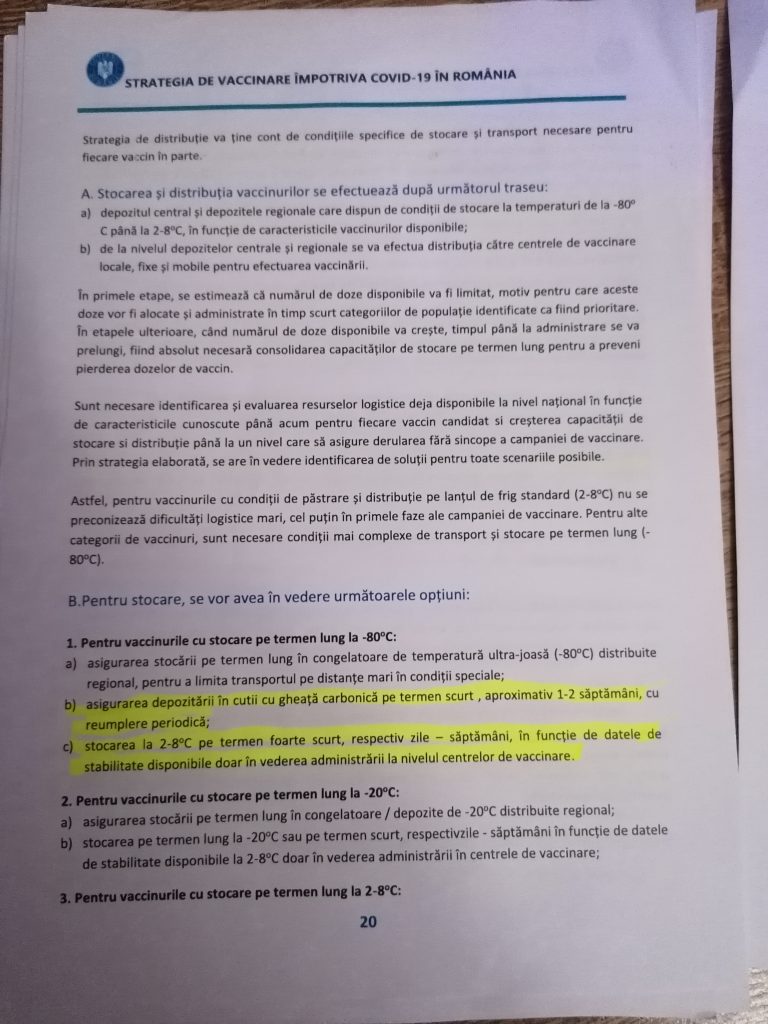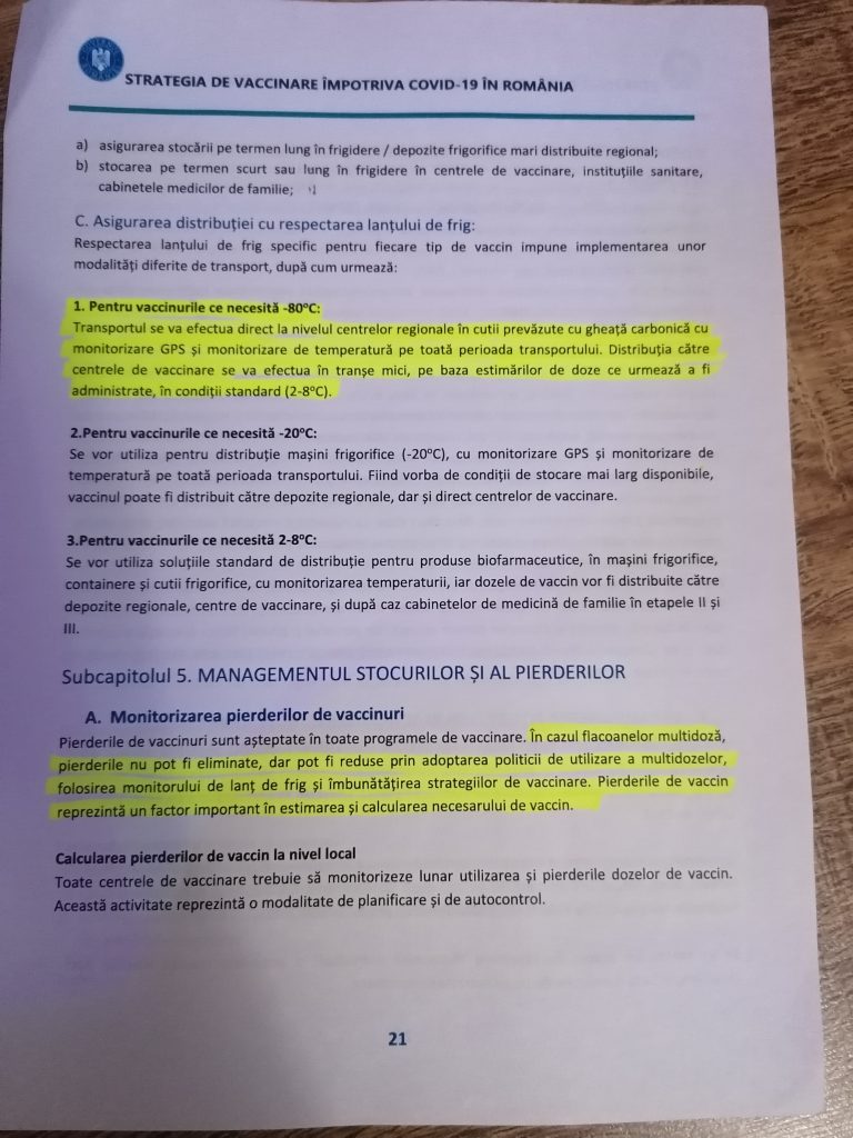 Dr. Irina Magdalena Dumitru: Vaccinul a ajuns în data de 26 decembrie de la Bucureşti. El este depozitat, în momentul de faţă, la Institutul Cantacuzino, congelat, la temperaturi de minus 80 de grade. Condiţiile de păstrare sunt unele mai delicate. Sunt acolo frigidere. Vaccinul poate sta la temperaturi mult mai mici de minus 2 şi 8 de grade timp de 5 zile. În aceste 5 zile noi ne putem vaccina. Este mai laborios de preparat. Un flacon conţine 6 doze, dar se administrează pentru cinci persoane. Vaccinul este sub formă de pudră. Pudra se diluează şi se administrează concomitent la cinci persoane. Vom intra pe rând câte 5 persoane. Vaccinul se administrează intramuscular, în deltoid, după o anamneză riguroasă. Vor fi excluse de la vaccinare persoanele cunoscute cu alergii importante în antecedente. Vom aştepta apoi 15-20 de minute, pentru că reacţiile adverse apar în primele minute după vaccinare. Dacă nu se întâmplă nimic, plecăm acasă şi totul este în regulă.