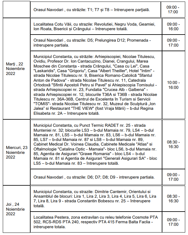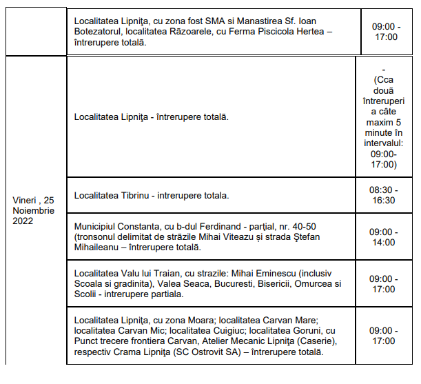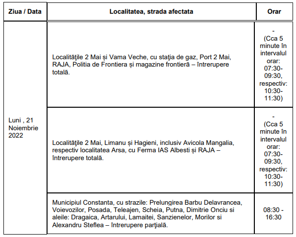 Următoarele întreruperi se vor realiza pentru a asigura capacitatea rețelei de a funcționa și alimenta clienții în bune condiții.