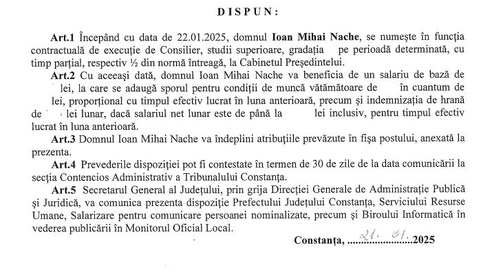 ,,Începând cu data de 22.01.2025, domnul Ioan Mihai Nache, se numeşte în funcția contractuală de execuție de Consilier, studii superioare, gradația pe perioadă determinată, cu timp parţial, respectiv din normă întreagă, la Cabinetul Preşedintelui”, se arată în dispoziție.