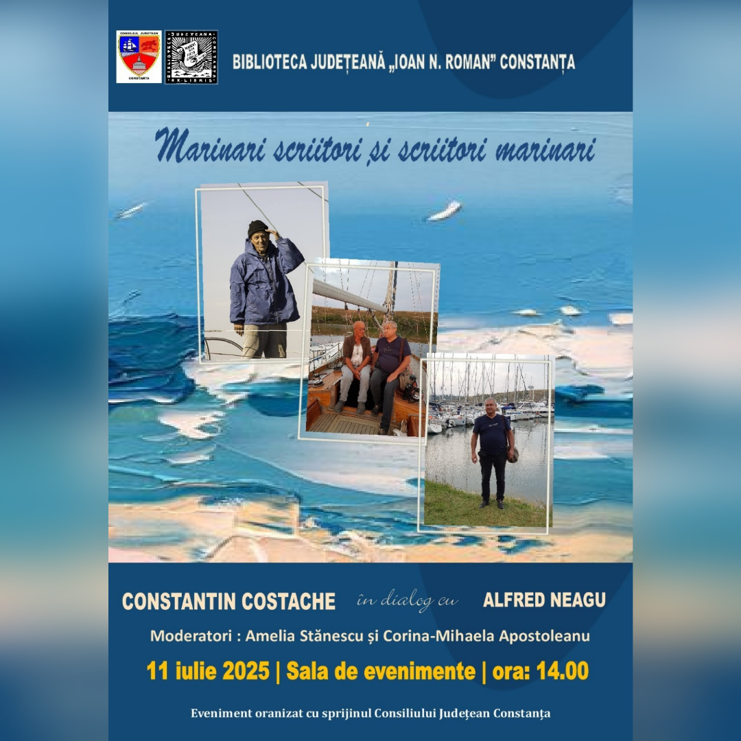 Vineri, 11 iulie a.c., la ora 14.00, la Biblioteca Județeană „Ioan N. Roman” Constanța va avea loc dezbaterea cu tema „Marinari scriitori și scriitori marinari” susținută de scriitorul și traducătorul Alfred Neagu și de romancierul Constantin Costache, membru al Filialei Dobrogea a Uniunii Scriitorilor din România. Evenimentul este susținut de Consiliul Județean Constanța.