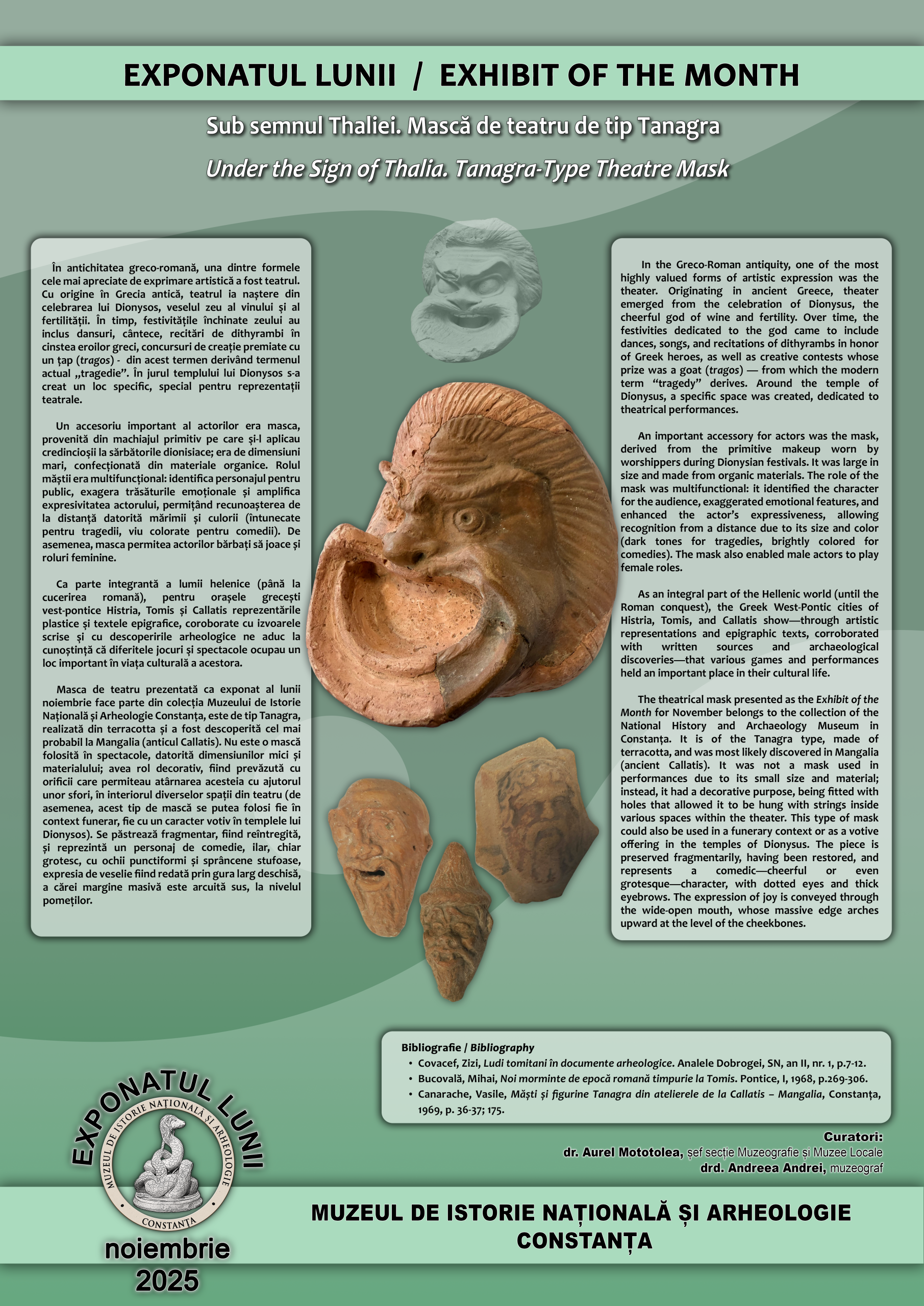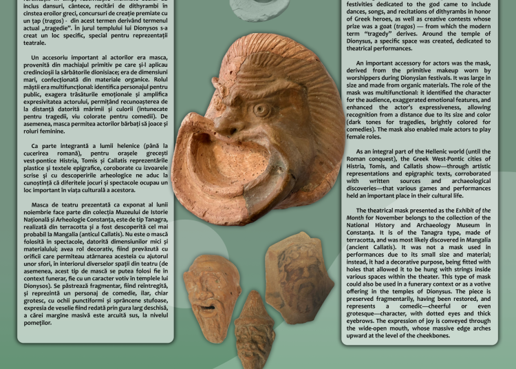 Masca de teatru prezentată ca exponat al lunii noiembrie face parte din colecția Muzeului de Istorie Națională și Arheologie Constanța, este de tip Tanagra, realizată din terracotta și a fost descoperită cel mai probabil la Mangalia (anticul Callatis). Nu este o mască folosită în spectacole, datorită dimensiunilor mici și materialului; avea rol decorativ, fiind prevăzută cu orificii care permiteau atârnarea acesteia cu ajutorul unor sfori, în interiorul diverselor spații din teatru (de asemenea, acest tip de mască se putea folosi fie în context funerar, fie cu un caracter votiv în templele lui Dionysos). Se păstrează fragmentar, fiind reîntregită, și reprezintă un personaj de comedie, ilar, chiar grotesc, cu ochii punctiformi și sprâncene stufoase, expresia de veselie fiind redată prin gura larg deschisă, a cărei margine masivă este arcuită sus, la nivelul pomeţilor.