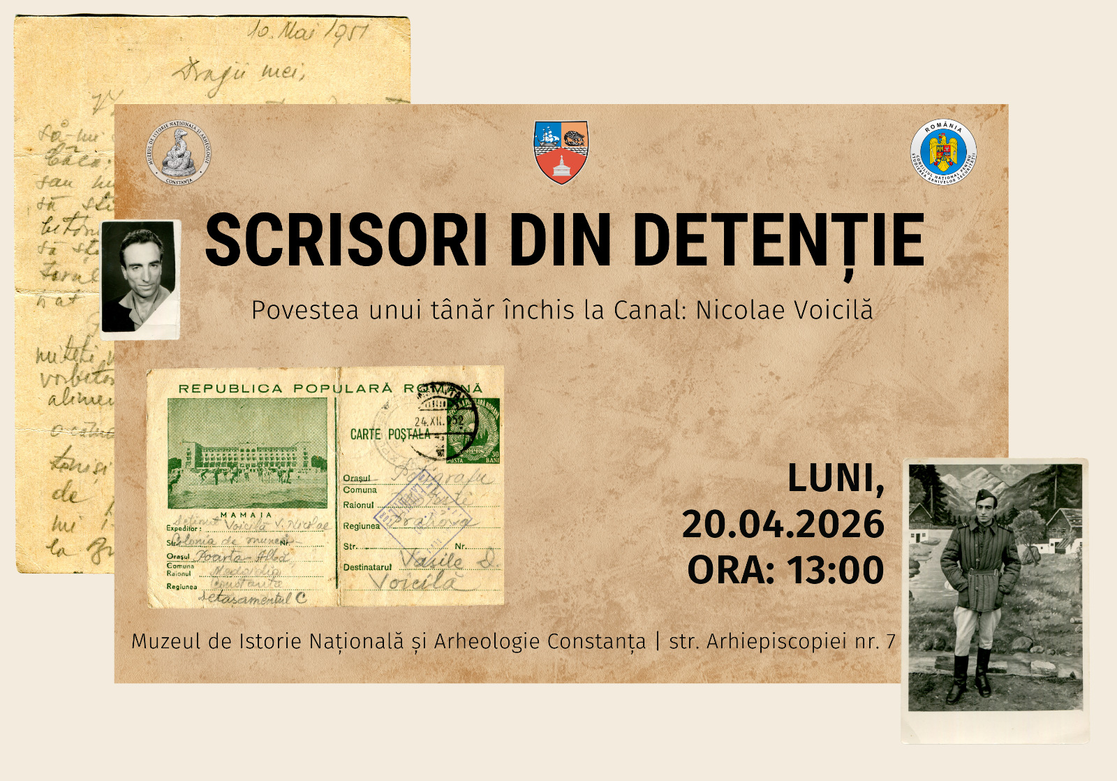 Povestea unui tânăr închis la Canal: Nicolae Voicilă”. Evenimentul va avea loc la sediul muzeului din strada Arhiepiscopiei nr. 7, municipiul Constanța.