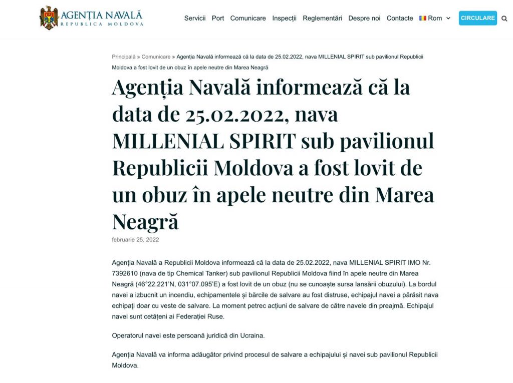 Agenția Navală a Republicii Moldova într-un comunicat de presă că nava comercială MILLENIAL SPIRIT, aflată sub pavilionul Republicii Moldova, a fost lovită vineri de un obuz în Marea Neagră. Informația a fost confirmată și de MAPN.