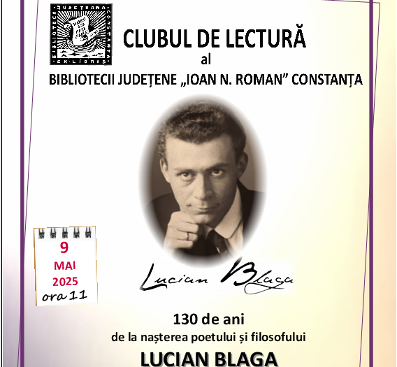 O nouă ediție a „Clubului de lectură” al Bibliotecii Județene „Ioan N. Roman” Constanța va avea loc vineri, 9 mai 2025, de la ora 11:00, la sediul central al bibliotecii, sala „Liliana Lazia”, etajul al II-lea. De această dată, clubul este consacrat lui Lucian Blaga, de la nașterea căruia se împlinesc, în chiar ziua reuniunii noastre, 130 de ani.