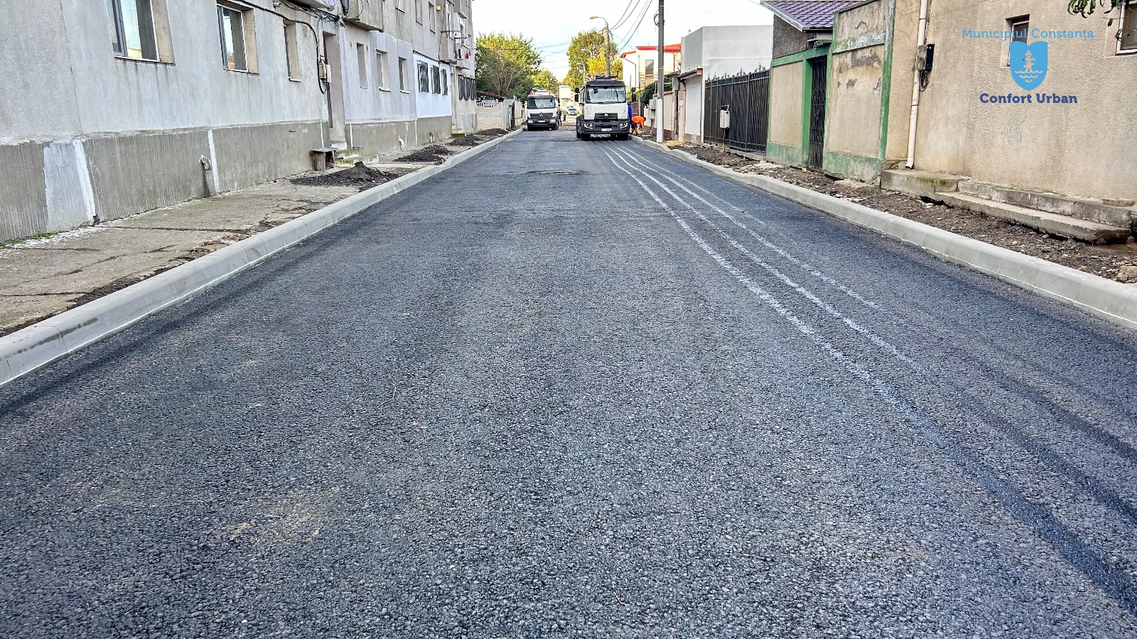 În paralel, se lucrează la reabilitarea trotuarelor. Se înlocuiesc bordurile, iar terenul este stabilizat în vederea pregătirii pentru asfaltare.