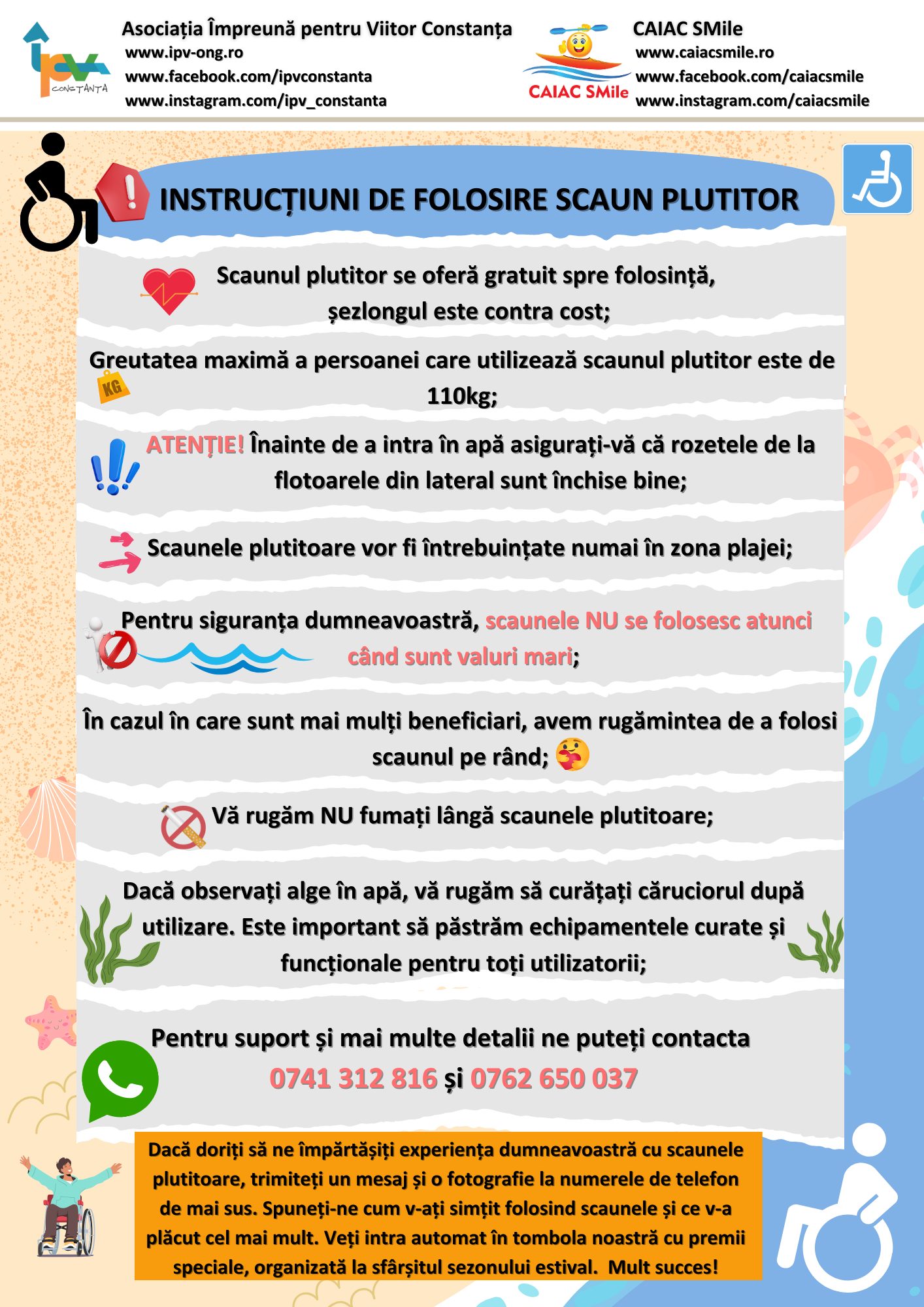 3. Accesibilitate – SCAUNELE PLUTITOARE se oferă gratuit spre folosință în zona plajei pe baza certificatului de handicap/legitimație/buletin.
