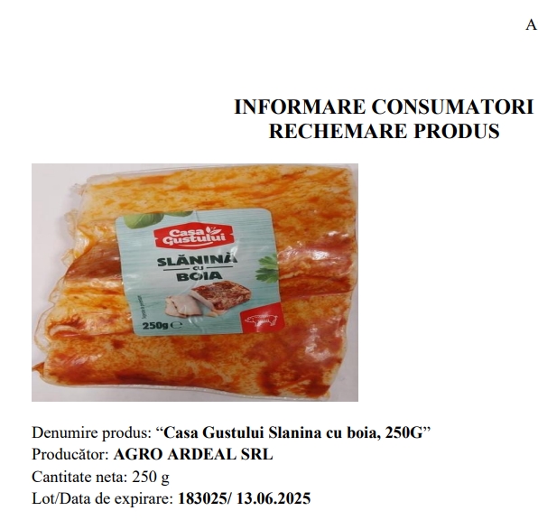 Este vorba despre un lot de slănină cu boia, în care a fost detectată prezenţa bacteriei Listeria Monocytogenes.