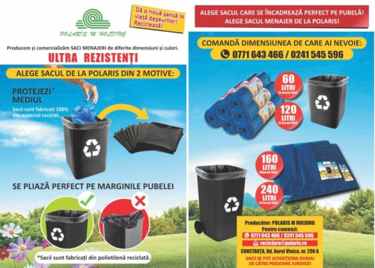 Sacii sunt fabricați 100% din material reciclat! Polaris sugerează constănțenilor să colecteze deșeurile reciclabile în sacul produs de ei și întreg conținutul sacului (inclusiv sacul) va fi reciclat!