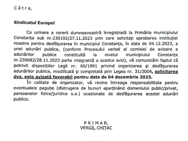 Sindicaliștii au făcut publică și autorizația eliberată de Primăria Constanța cu privire la desfășurarea acestei acțiuni de protest.