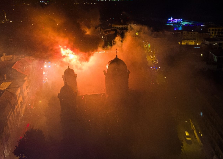 În noaptea de sâmbătă, 15 octombrie, cu puțin înainte de ora 22.00 a izbucnit un teribil incendiu. Flăcările s-au extins cu repeziciune, iar turnurile Palatului Arhiepiscopal au început să se prăbușească. La ora la care pompierii au fost anunţaţi de producerea incendiului, Înalt Prea Sfinţitul Teodosie oficia la Catedrala Arhiepiscopală Acatistul Învierii Domnului. Catedrala Arhiepiscopală se află foarte aproape de locul incendiului. Slujba religioasă a fost transmisă pe pagina de Facebook a Arhiepiscopiei Tomisului, dar a fost întreruptă la un moment dat.