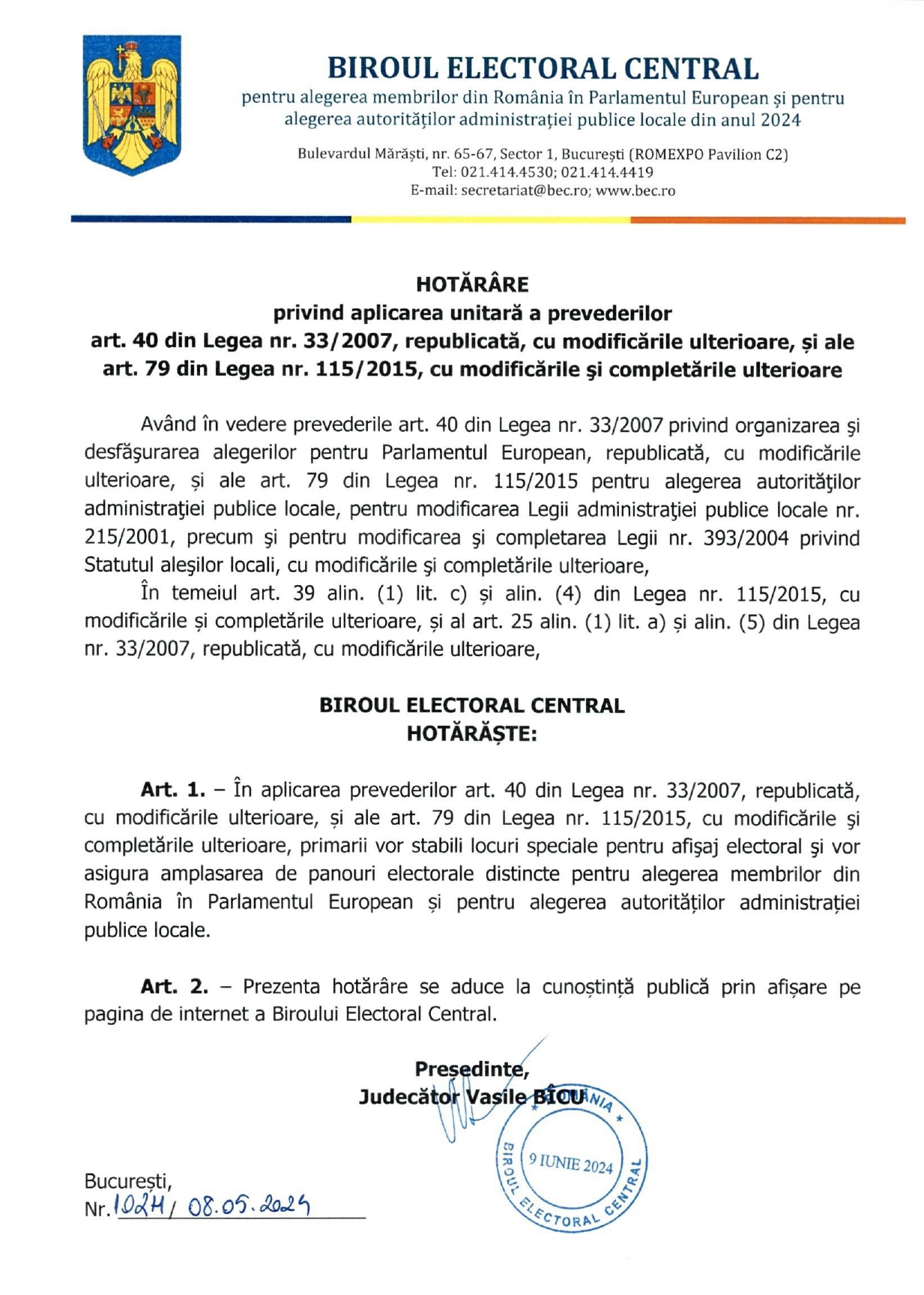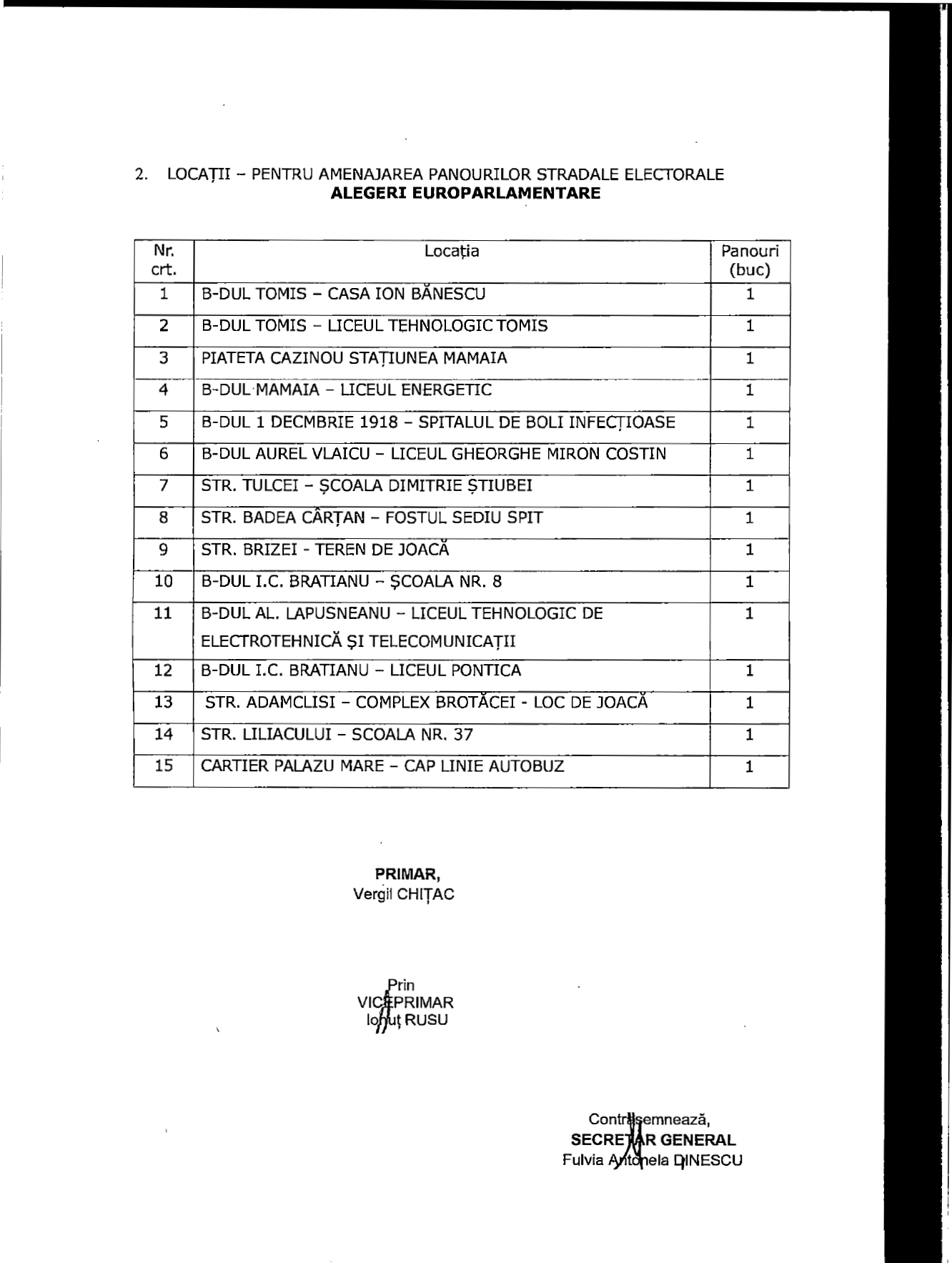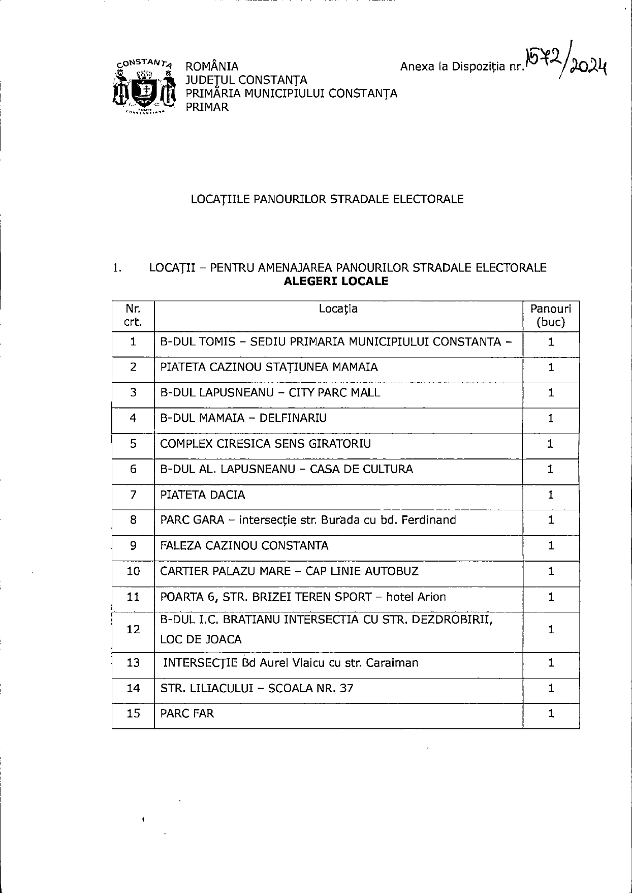 Ulterior, ca urmare a Hotărârii Biroului Electoral Central nr. 1024 din 08.05.2024, în data de 09.05.2024, a fost emisă o dispoziție prin care se stabilește, în conformitate cu prevederile legale, locațiile și numărul panourilor electorale din municipiul Constanța.