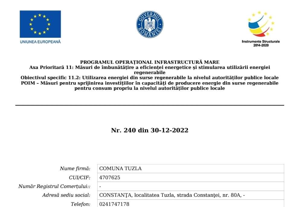 Reșit Taner, primarul comunei Tuzla anunță că la nuvelul comunei se află în desfășurare, prin Programul Operațional Infrastructură Mare proiectul: Utilizarea energiei din surse regenerabile la nivelul autorităților publice locale – Măsuri pentru sprijinirea investițiilor în capacități de producere energie din surse regenerabile pentru consum propriu la nivelul autorităților publice locale.
