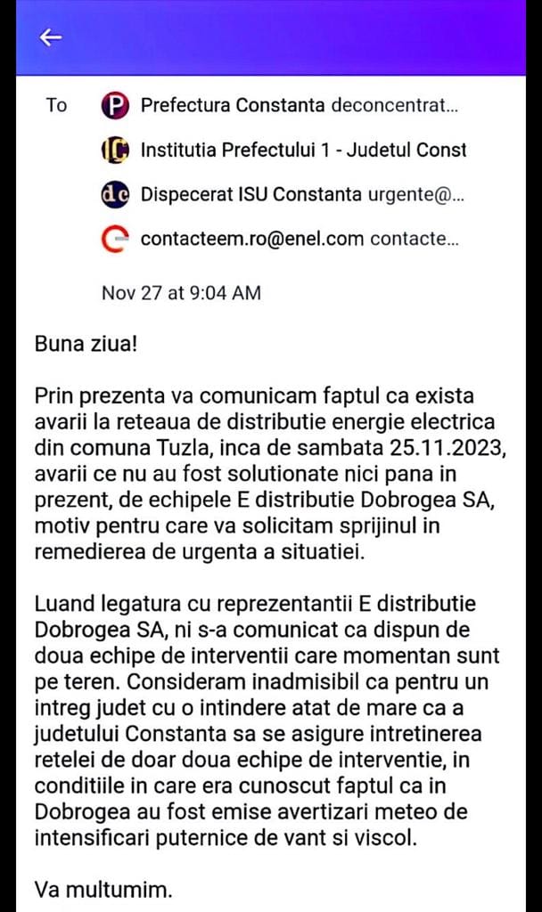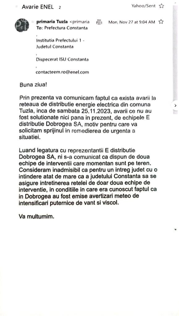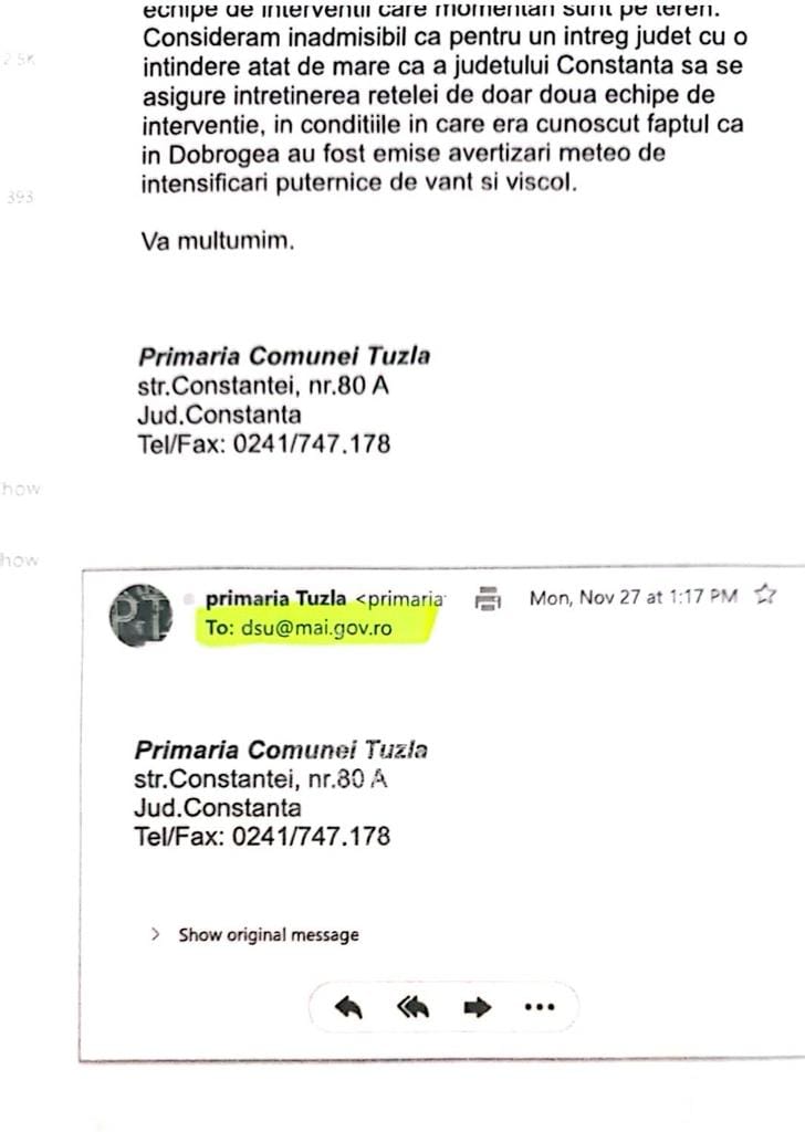 ”Având în vedere informațiile neadevărate apărute în spațiul public prin intermediul rețelelor de socializare de către anumiți consilieri locali cu privire la lipsa de implicare a administrației locale în criza generată de furtunile de săptămâna trecută, vă comunic faptul că încă din data de 27.11.2023, orele 09:00 am făcut demersuri susținute către autoritățile statului, ( Instituția Prefectului Județul Constanța, Dispecerat ISU Constanța) responsabile cu aceste situații grave, generate de înrăutățirea vremii în comuna Tuzla și în tot județul Constanța.Astfel, în cadrul serviciului privind situațiile de urgență în data de 27.11.2023 am solicitat intervenția imediată a echipajelor aparținând distribuitorului de energie electrică să intervină la punctele afectate grav, situație ce a fost abordată de către Enel-Distribuție Dobrogea în aceeași zi, cu dificultate din cauza accesului îngreunat de consecințele vremii nefavorabile și a faptului că tot județul a avut în același timp avarii de rețea.
