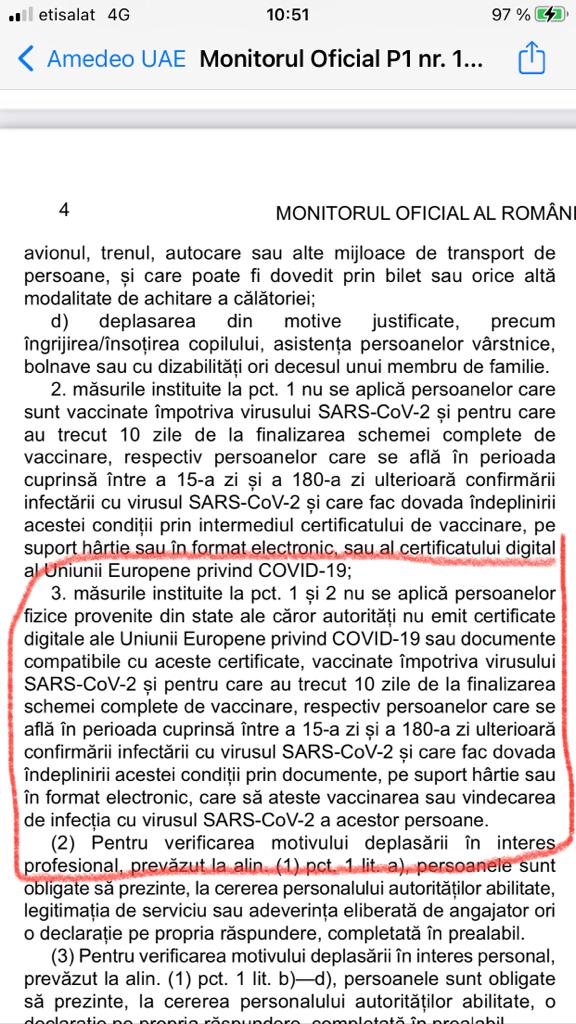 ”Măsurile instituite (circulația persoanelor în afara locuinței/gospodăriei în intervalul orar 22,00—5,00 cu unele excepții – n.r.) nu se aplică persoanelor fizice provenite din state ale căror autorități nu emit certificate digitale ale Uniunii Europene privind COVID-19 sau documente compatibile cu aceste certificate, vaccinate împotriva virusului SARS-CoV-2 și pentru care au trecut 10 zile de la finalizarea schemei complete de vaccinare, respectiv persoanelor care se află în perioada cuprinsă între a 15-a zi și a 180-a zi ulterioară confirmării infectării cu virusul SARS-CoV-2 și care fac dovada îndeplinirii acestei condiții prin documente, pe suport hârtie sau în format electronic, care să ateste vaccinarea sau vindecarea de infecția cu virusul SARS-CoV-2 a acestor persoane”, după cum se arată în M.O.
